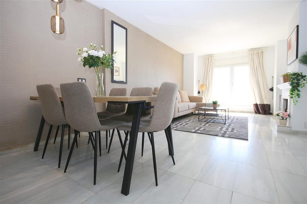 A modern and spacious family townhouse located in the popular complex of Belgravia Club next to Estepona port. The three level property has a lovely south facing balcony with awning and amazing views to the marina and sea with two sun loungers and an outdoor dining area for up to four guests. The house is equipped with three spacious bedrooms with independant air conditioning in all bedrooms and living room. The top (second) floor bedroom has a king size bed (150x190cm), en-suite bathroom with shower cabin, WC, bidet and hand-basin. The washing machine is also located in this bathroom. On the first floor you will find the second and third bedroom, one with a super king-size bed (180x200cm) and another en-suite bathroom with bath with over-head shower, WC, bidet and hand-basin. The third bedroom on this level is equipped with a single bed (90x190cm) and a super-king size bed (180x200cm). There is a family bathroom with bath and over-head shower, WC, bidet and hand-basin. The large lounge/dining area has a comfortable sofa for four with international TV (including Sky) and a high speed fibre optic internet connection. The dining area next to the lounge is for six guests. The modern open kitchen provides a fridge freezer, cooking hob, oven, microwave and dishwasher. The community swimming pool, with loungers available, is just a few minutes’ walk from the front door of the house. There is a BBQ area available by the pool which you can reserve through the community for a small fee. A six minute walk to the marina with its bars, cafes, restaurants and supermarkets. A car is definitely not required in this location but parking in a closed community is available if needed (on a first come, first served basis). There is also an electric car charging point in the complex plus you may also head down directly to the parking area next to Playa del Cristo beach, so ideal for families with children.