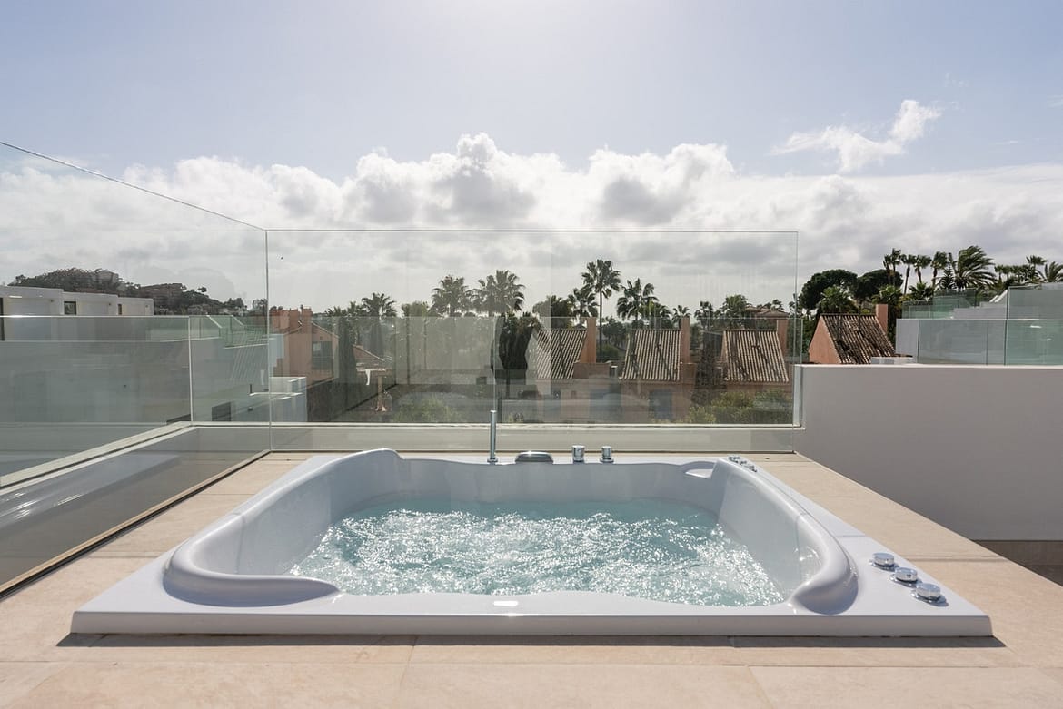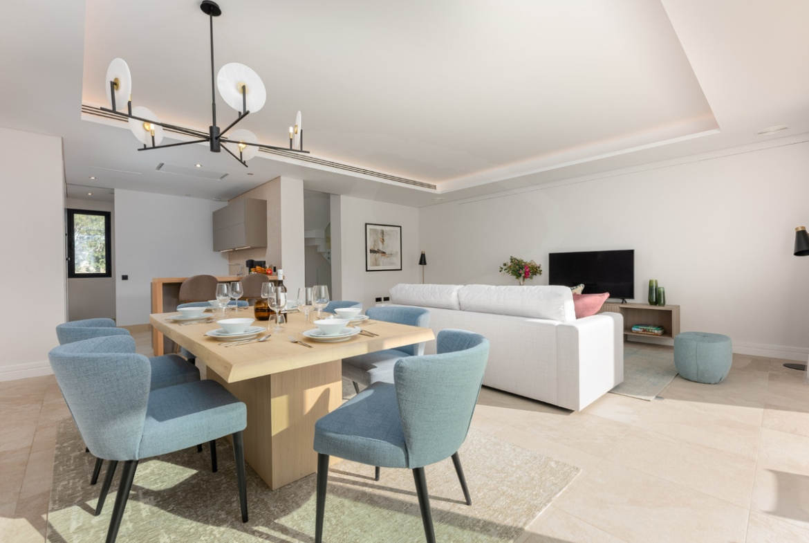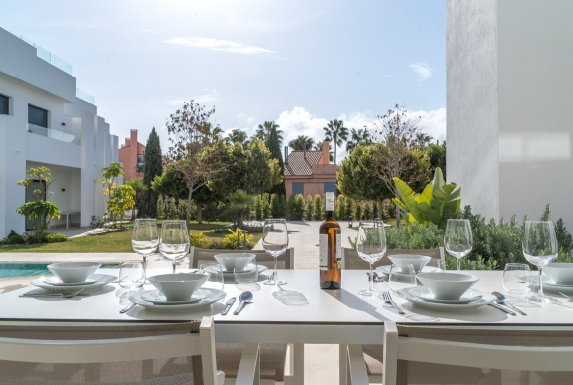 This beautiful three bedroom townhouse is situated in the heart of Nueva Andalucía and offers a serene residential experience with its closed residential complex featuring security and surveillance. Nestled in a tranquil environment surrounded by nature, the spacious layout of the houses provides ample privacy, complemented by a large communal garden and pool area.