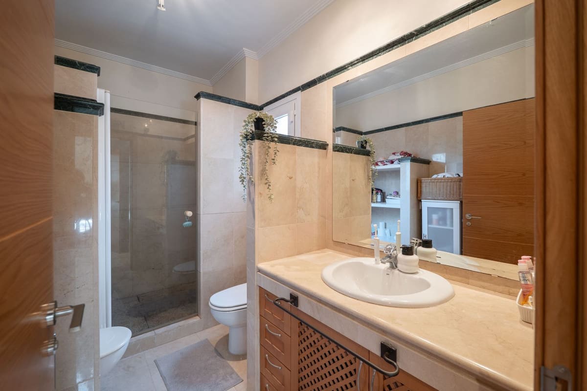 The property is distributed over 2 levels and offers a functional and comfortable layout. It features 3 spacious bedrooms, each with its own en-suite bathroom, providing privacy and convenience. The separate kitchen is fully equipped and includes a breakfast area, while the ground floor also benefits from a guest toilet and a storage room.