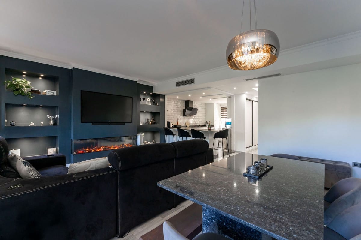 Main floor: Bright living room with an electric feature fireplace and direct access to a private 17m² terrace boasting lovely mountain views. On this level you will also find the fully fitted open-plan kitchen and a guest cloakroom.