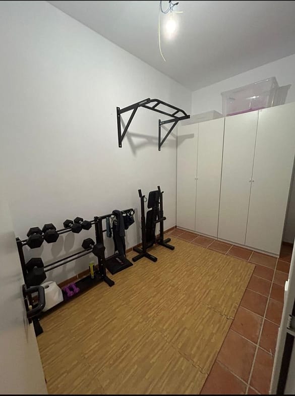 The property is distributed over several floors and has a total of 3 bedrooms, two bathrooms plus a guest toilet, a living room with an open-plan kitchen, a terrace with a garden, a solarium of approximately 35m2, and a basement currently used as a gym and storage area.