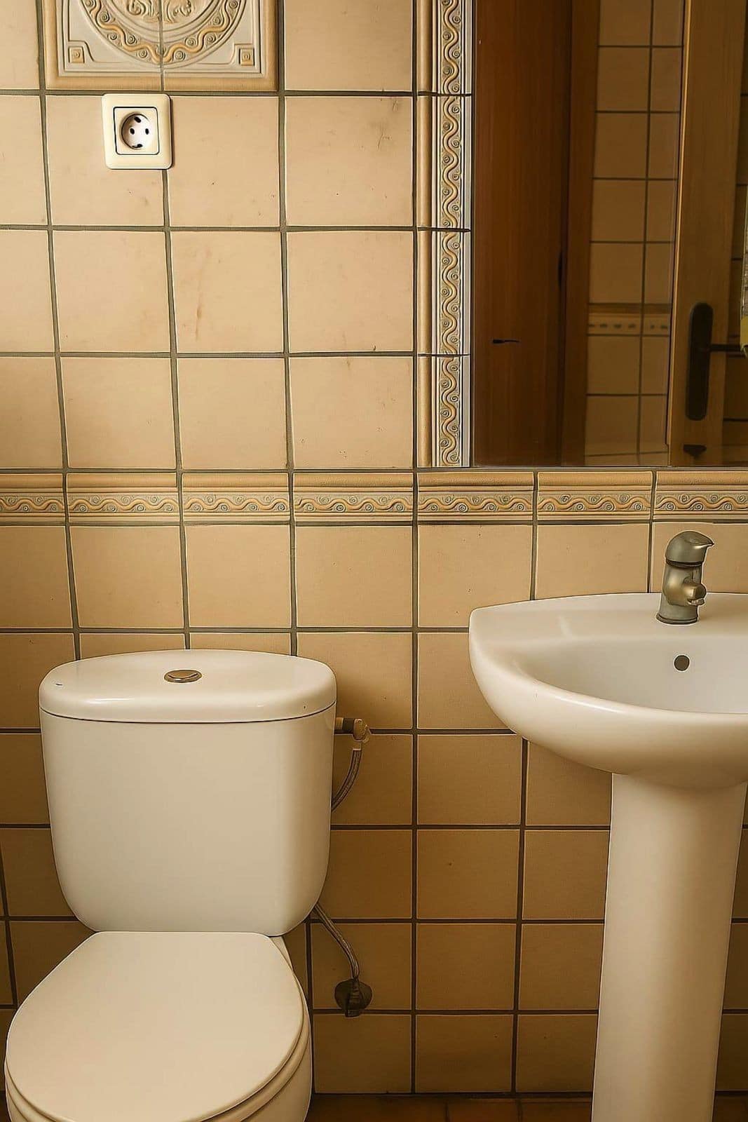 Upstairs you will find three bedrooms (two generous doubles, one with en-suite bathroom, and one single), built-in wardrobes throughout, and two additional full bathrooms. The property benefits from elegant marble flooring, air conditioning, individual heating and a security alarm system. A private outdoor parking space is included right next to the house.