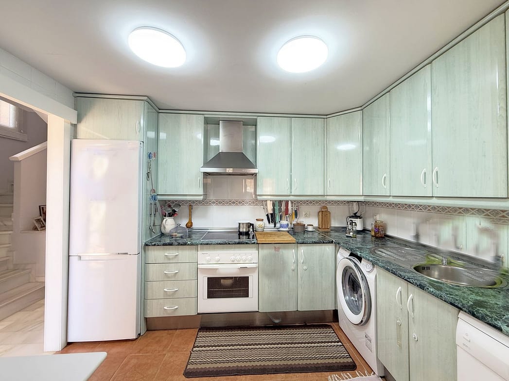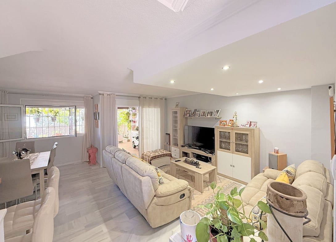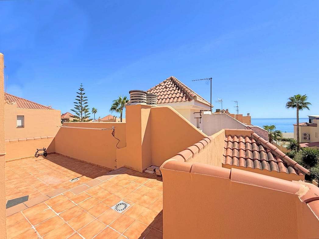 The property is distributed over two floors plus a spacious rooftop solarium with stunning sea views. It offers 3 bright and spacious bedrooms, a cozy living room, and a delightful Andalusian-style patio with fruit trees and direct access to the communal swimming pool and beautifully maintained gardens.