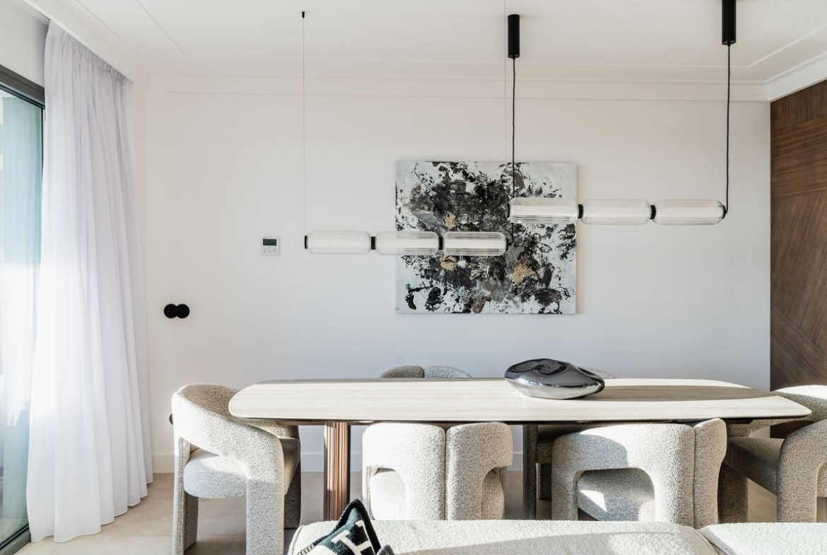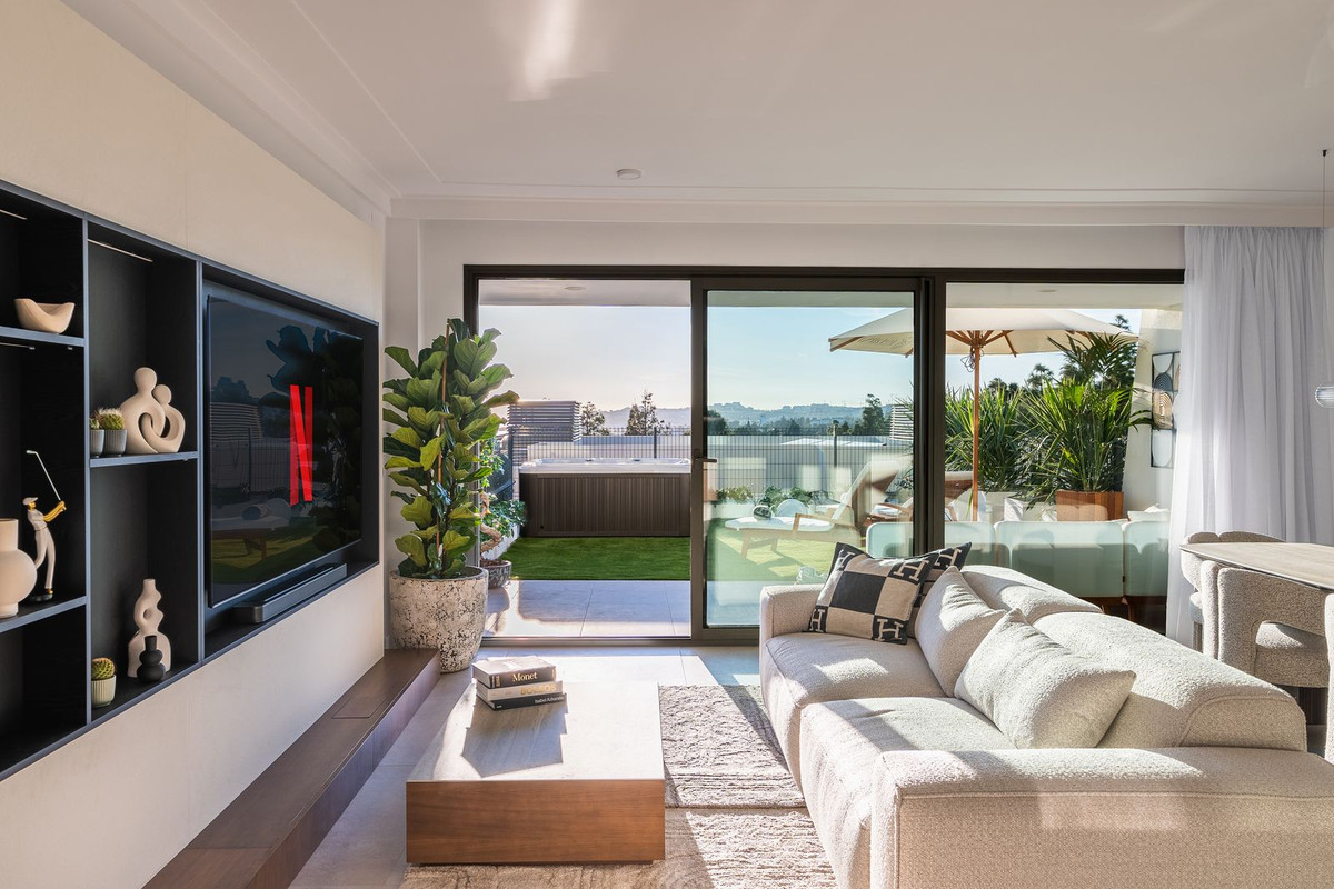 The home is sold fully furnished, curated by renowned designer Loriini with every detail—furniture, finishes, and décor—selected to create a cohesive, sophisticated space. Premium materials are used throughout, including high-quality porcelain flooring, Cortizo windows, and electric aluminium shutters. An aerothermal heating/cooling system ensures year-round comfort.