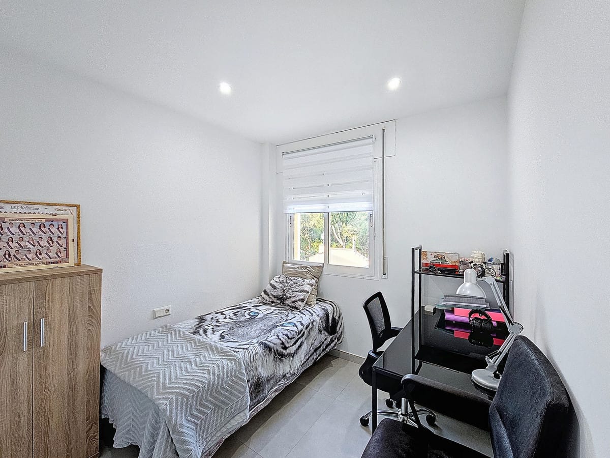 The first floor houses three bedrooms. The master bedroom has an en-suite bathroom and access to a terrace overlooking the community pool. The other two bedrooms share an additional bathroom, providing space and privacy for the whole family.