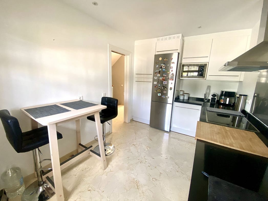 On the main floor, upon entering the house, we find a separate kitchen, a guest toilet and a spacious living-dining room with fireplace, perfect for creating a cosy atmosphere in the cooler months. From here, you can access a large terrace with direct access to the pool, a real privilege for sunny days.