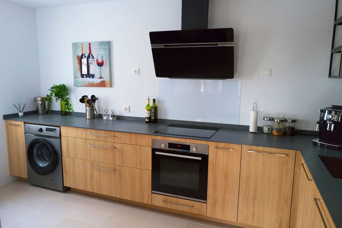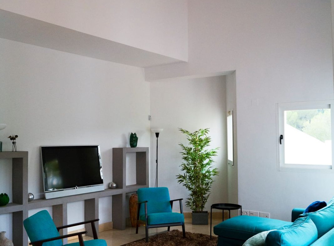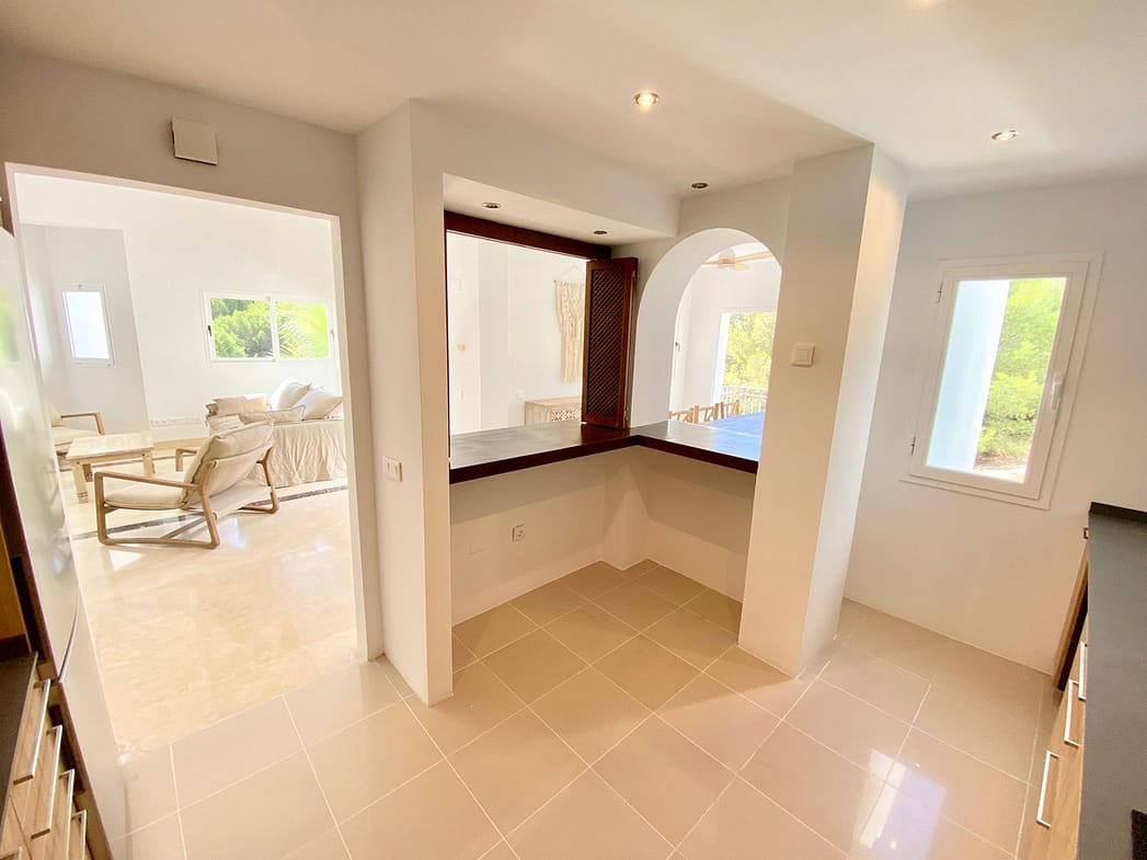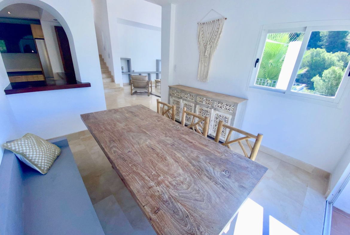 When entering this property you have the guest toilet Through the stairs you enter the spacious living room with separate dining area. With opening the sliding doors you reach the terrace.