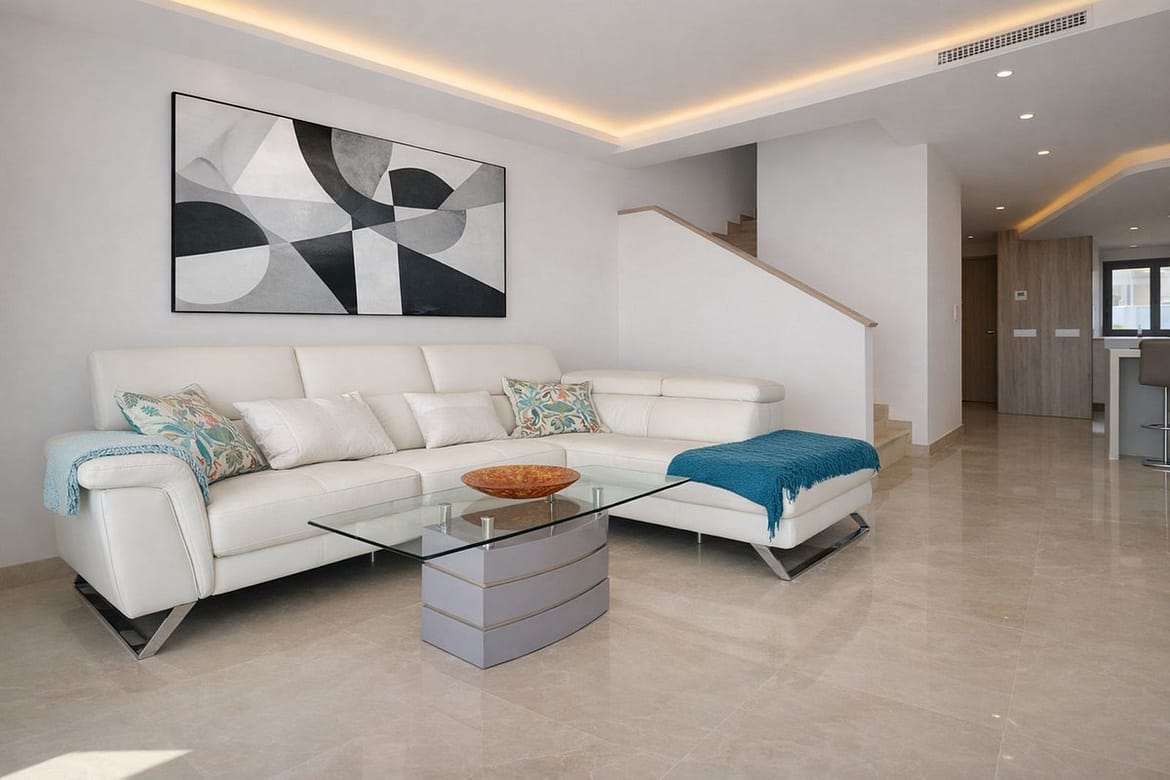 This elegant contemporary townhouse combines space, natural light and clean architectural lines, offering seamless indoor-outdoor living in a peaceful, high-quality setting. Finished with marble flooring throughout and a private elevator connecting all floors, the property presents a refined yet highly practical living environment, ideal as a permanent residence or a stylish holiday home.