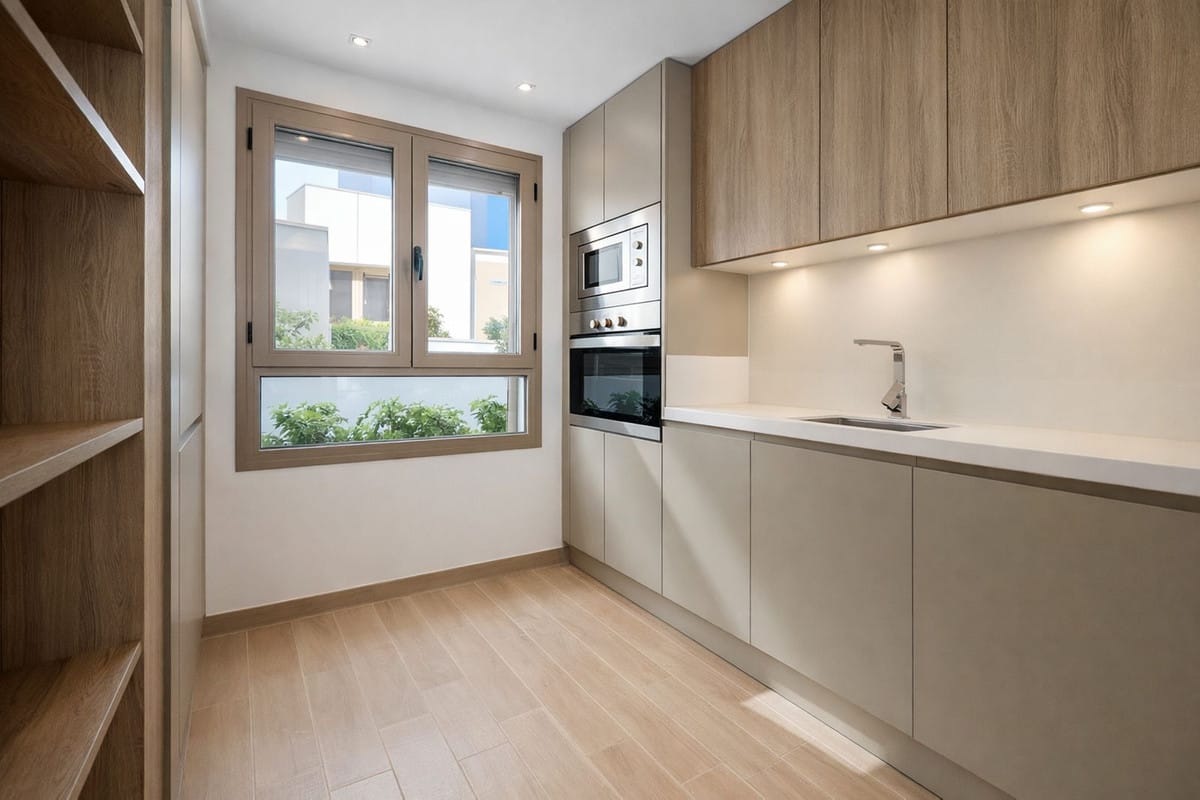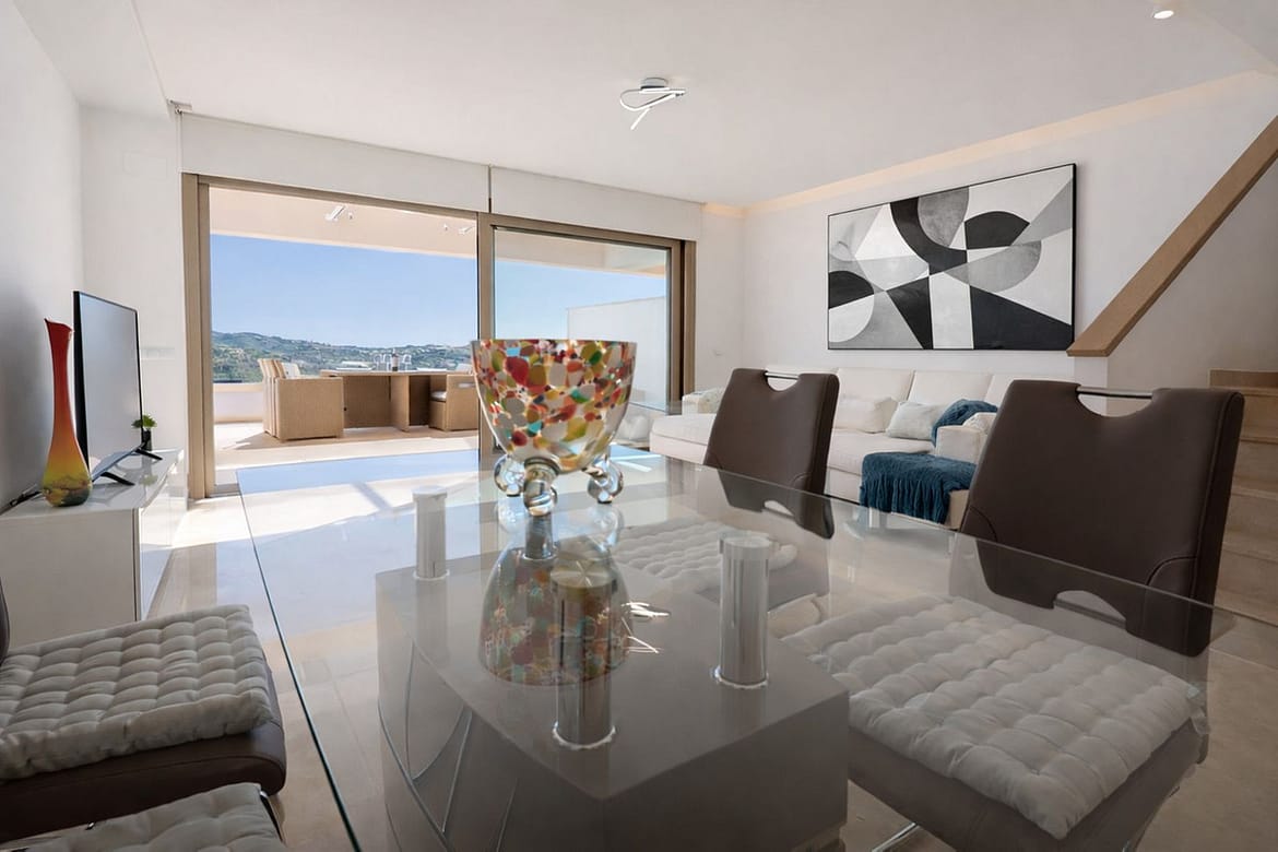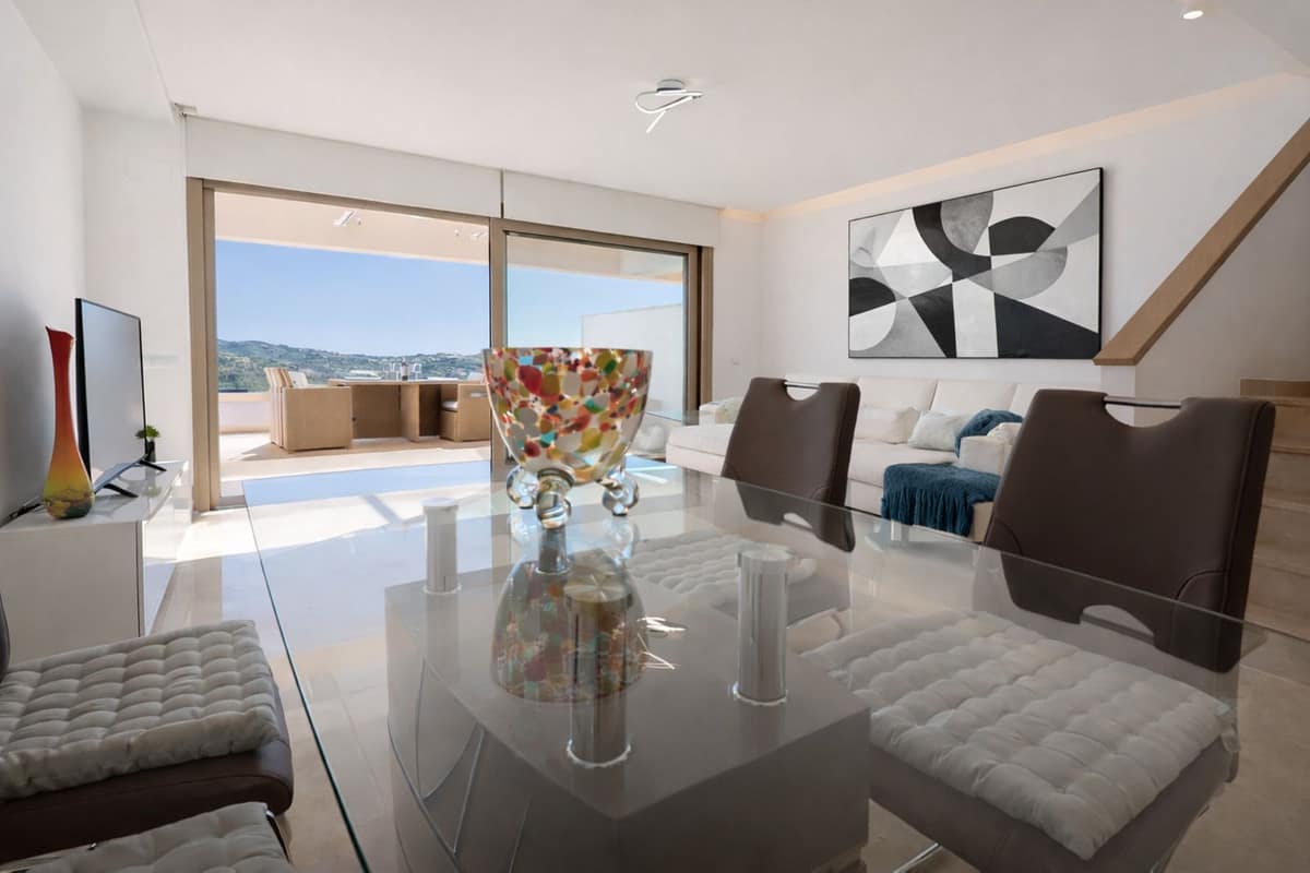 The main living area features a bright open-plan lounge and dining space with floor-to-ceiling sliding doors that open directly onto a private terrace, perfect for relaxing, entertaining or enjoying the Mediterranean climate all year round, with open views towards the golf course and surrounding mountains. A modern, fully equipped kitchen complements the living space, designed for both functionality and contemporary living.