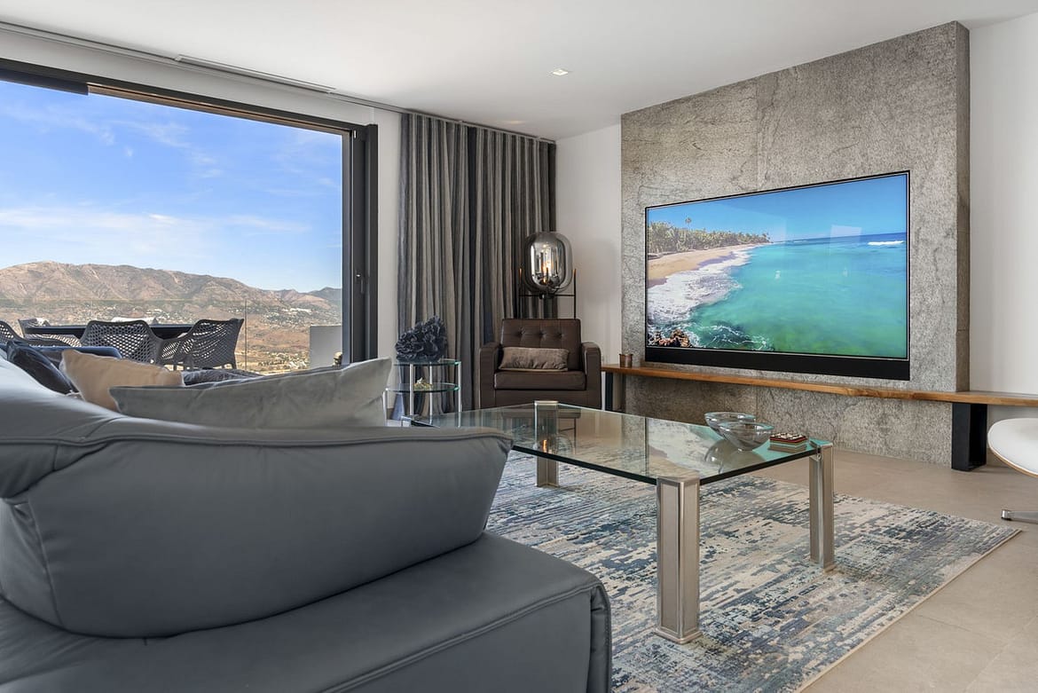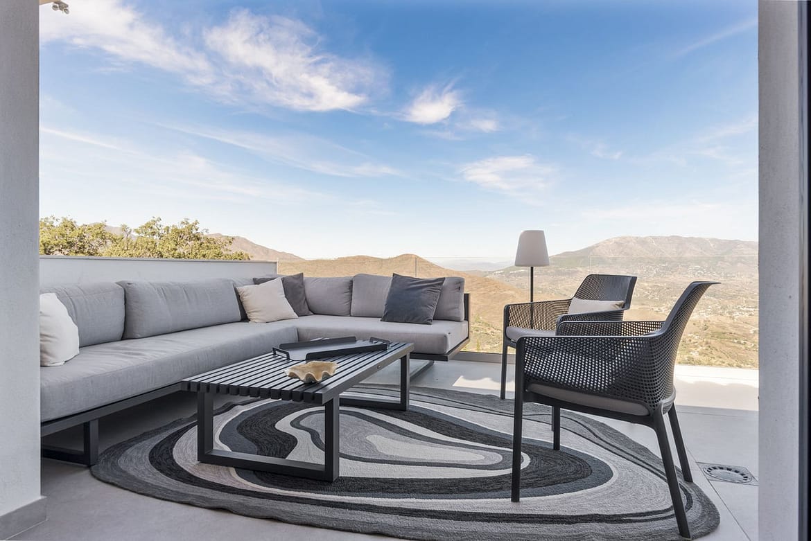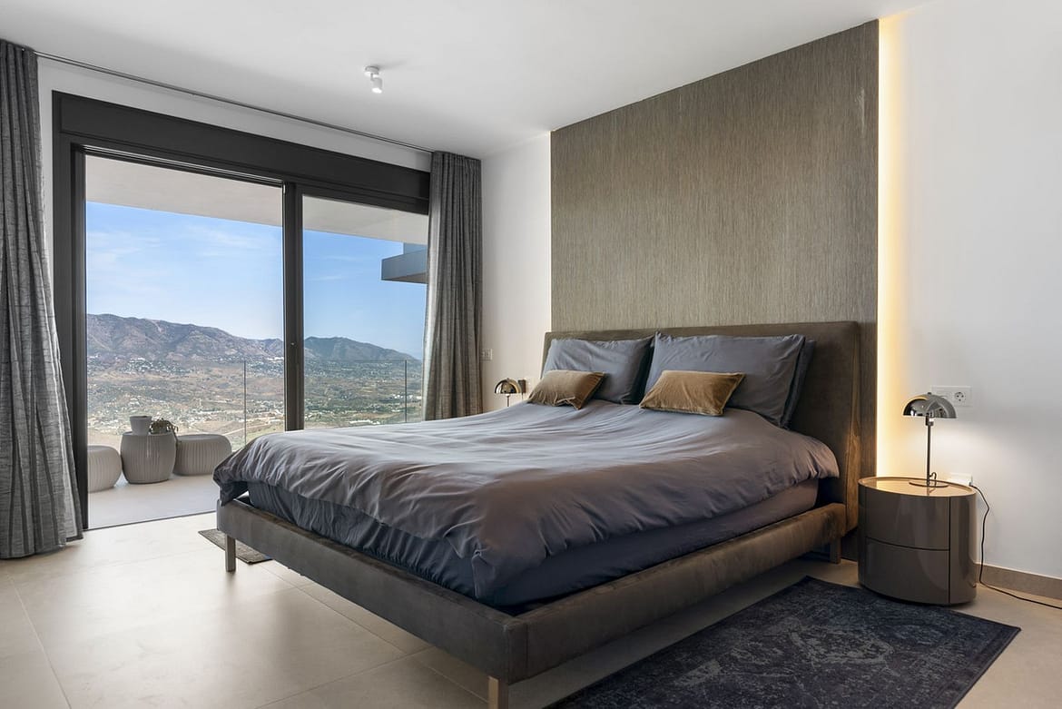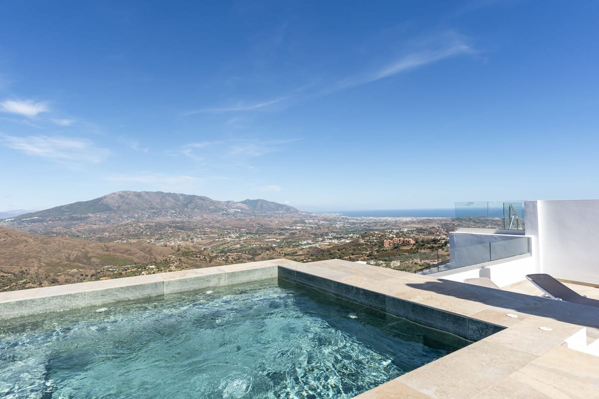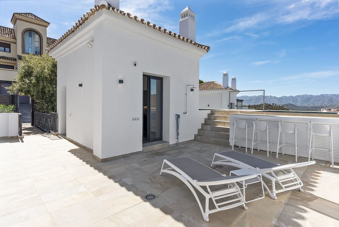 The top level is your personal outdoor oasis. This sun-soaked terrace is designed for relaxation, featuring a jacuzzi, plunge pool, and a bar area. Whether hosting guests or enjoying a quiet evening, the spectacular views of the UNESCO-protected Sierra Alpujata and the charming village of Mijas, sunrise over the Mediterranean in the west, and sunset over the national park ‘Sierra de las Nievas to the east. There’s also a guest toilet and a pedestrian bridge providing quick and convenient street access and parking from this level.