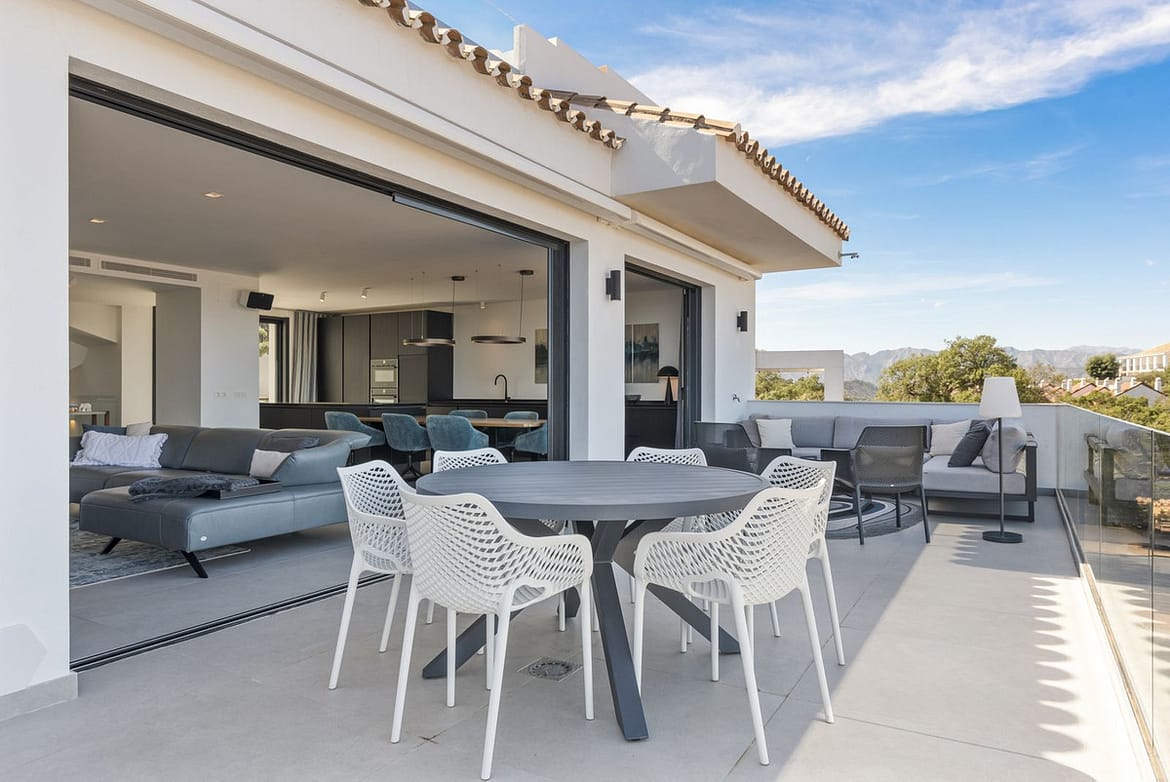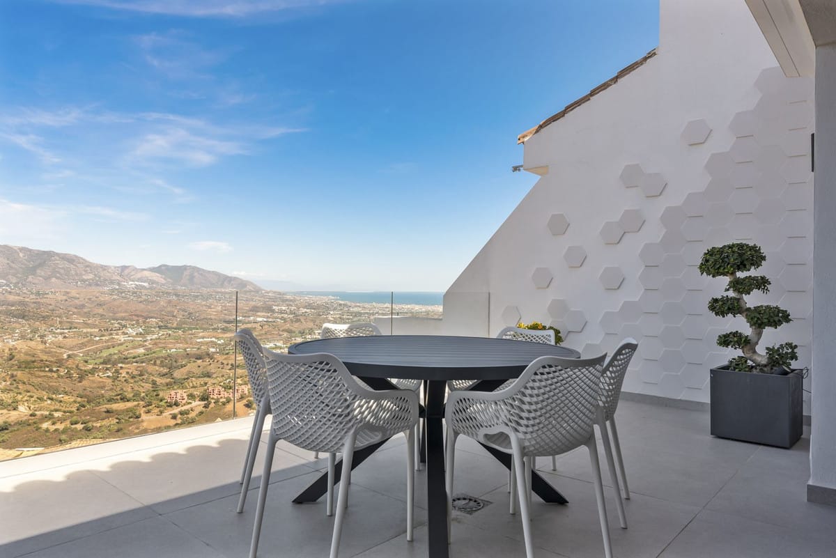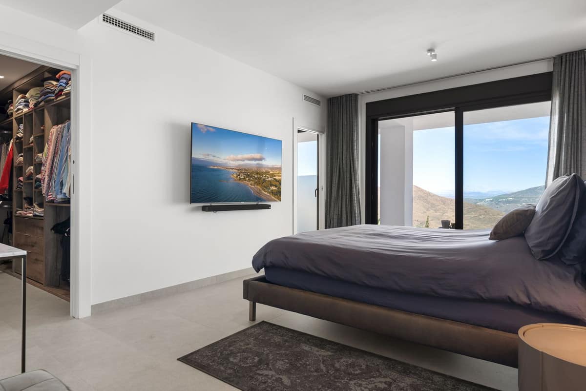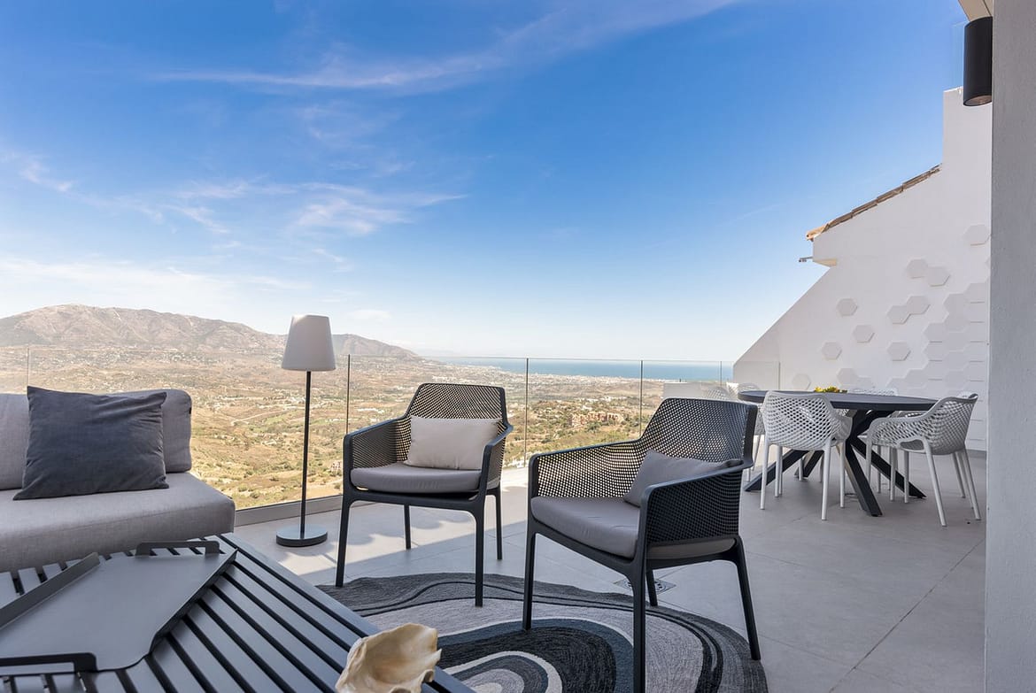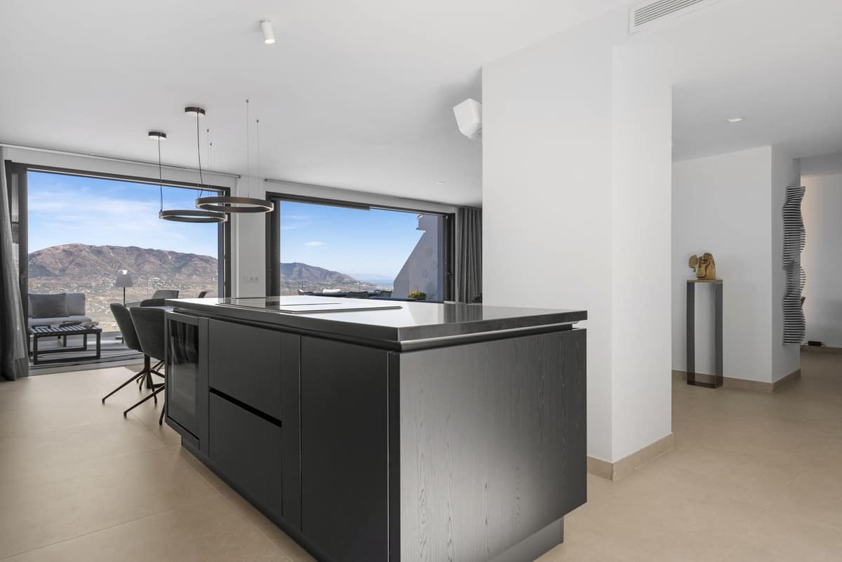The top level is your personal outdoor oasis. This sun-soaked terrace is designed for relaxation, featuring a jacuzzi, plunge pool, and a bar area. Whether hosting guests or enjoying a quiet evening, the spectacular views of the UNESCO-protected Sierra Alpujata and the charming village of Mijas, sunrise over the Mediterranean in the west, and sunset over the national park ‘Sierra de las Nievas to the east. There’s also a guest toilet and a pedestrian bridge providing quick and convenient street access and parking from this level.