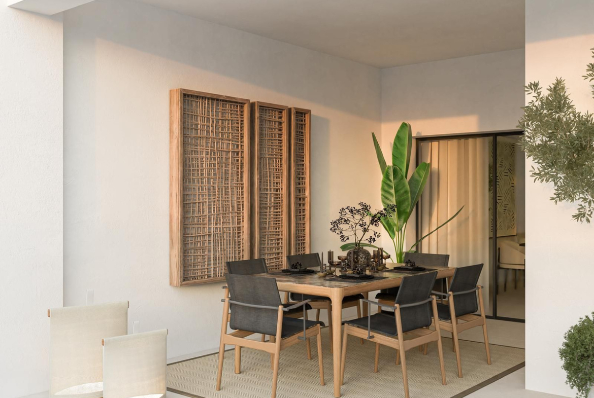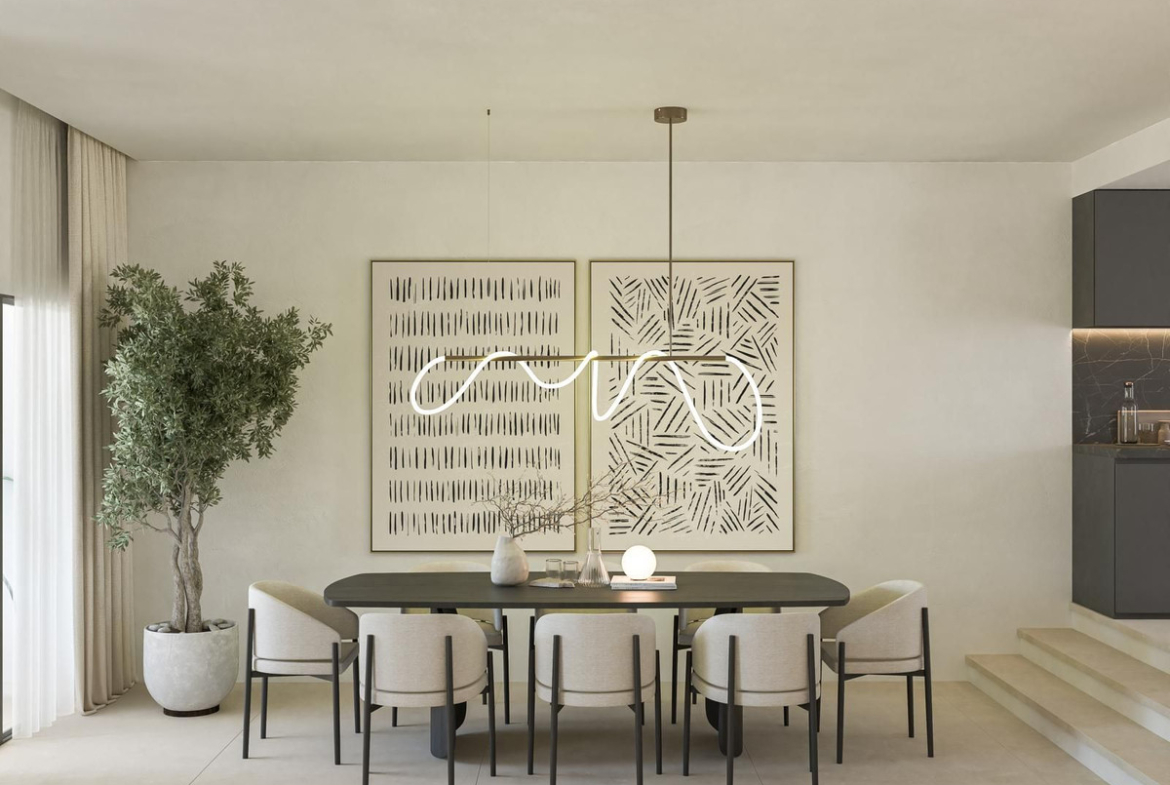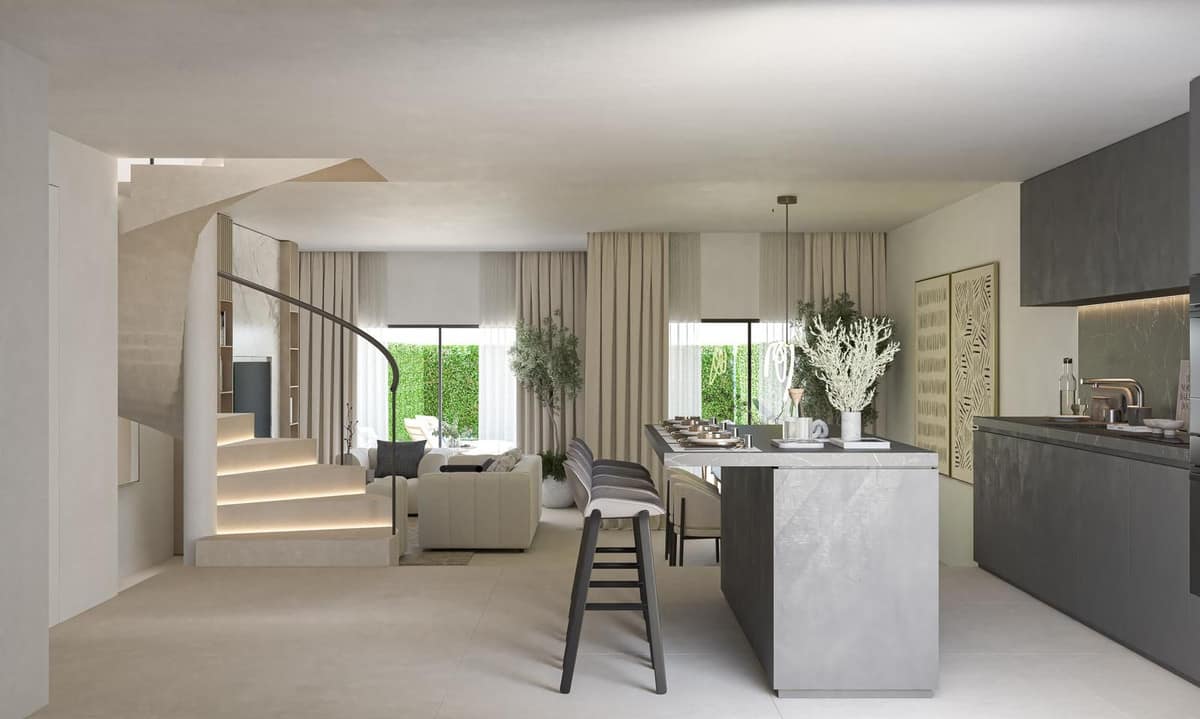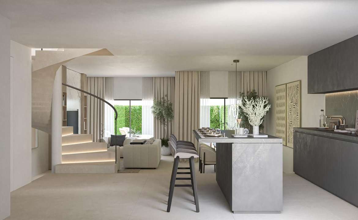 A property with a vast square meterage, the ground floor enjoys ample space. The front entrance court yard is a statement piece that is private and with golf and bike storage. Moving into the house an incredible open plan kitchen living dining area which leads out onto covered and open terrace area and garden with overlooks the golf course.