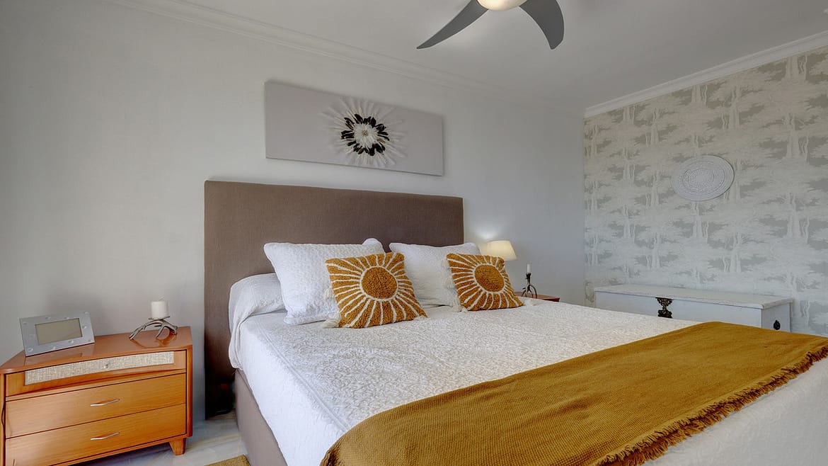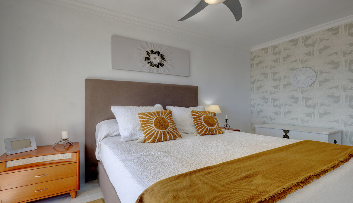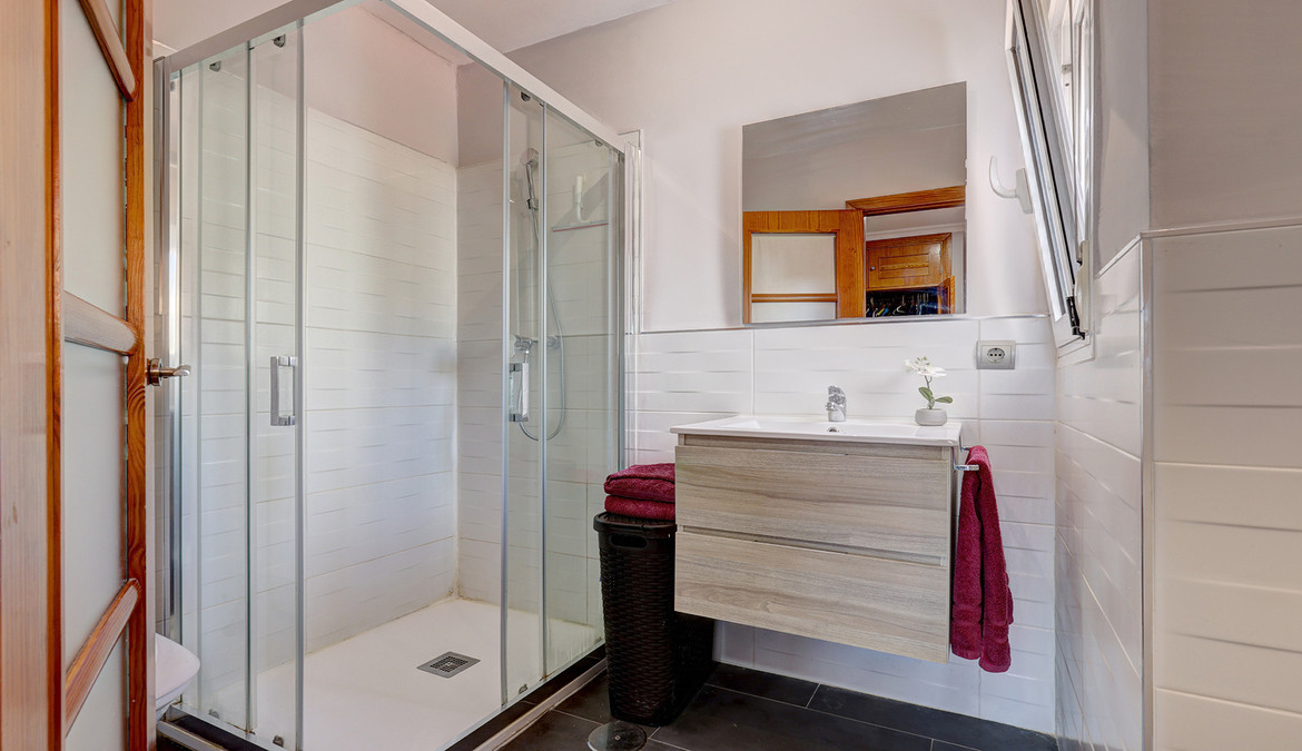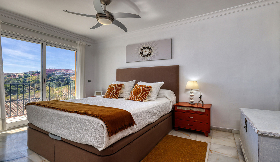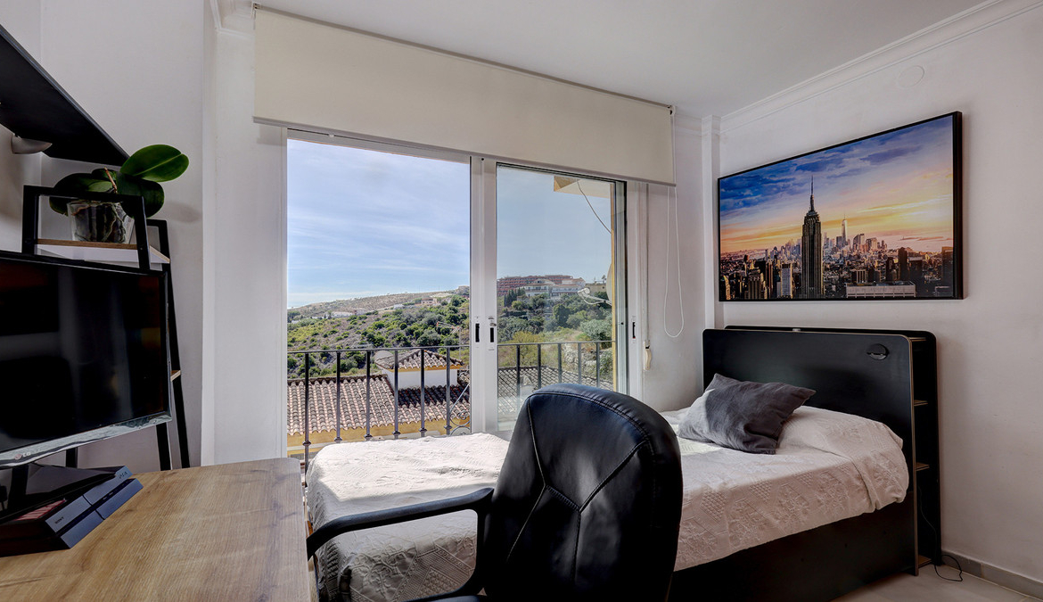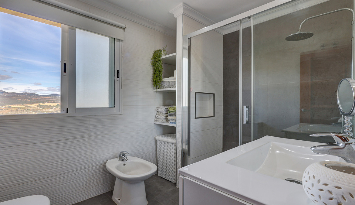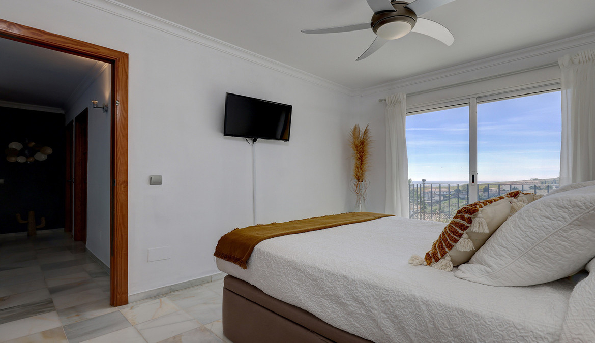 The first floor is home to three bedrooms and one bathroom. All bedrooms have balcony doors, are bright, and have excellent views. The main bedroom has a walk-in wardrobe and a balcony, is south-facing and has stunning views of the sea and across to the vineyards and mountains. The second bedroom has fitted wardrobes, a Juliet balcony and also has amazing sea views. The family bathroom has been refurbished and is modern with a walk-in shower. Even from here, there are stunning mountain views to the mountain range, Sierra Bermeja. The third bedroom is a double bedroom with fitted wardrobes and a private terrace. The views are beautiful over the pool, across the vineyards and to the sea.