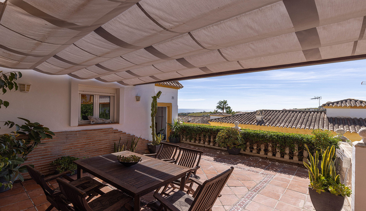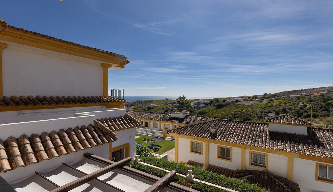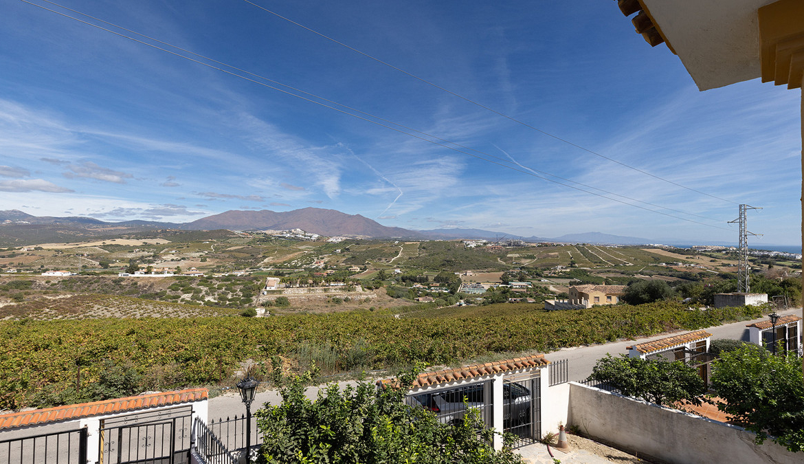 A fabulous Andalucian-style townhouse in Manilva Village with stunning panoramic views over the vineyards, across to the mountains and sea. A stunning setting. Located in a small urbanisation of only 23 houses with a communal pool and gardens.
