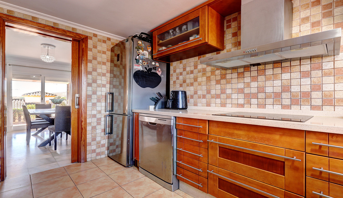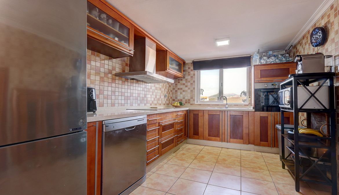 As you enter the house there is a large spacious living/dining room with a split level. The living area has a wood-burning fire making it very cosy on winter evenings. There is air-conditioning in the lounge. There are two sets of double balcony doors leading out from here to the terrace. The terrace is a lovely area with an awning so that you have shaded and unshaded areas. A stunning spot to dine al fresco whilst soaking up the mountain air, and taking in the beautiful sea views. There is also a view of the communal pool. Tucked away in the corner is access to a utility room.