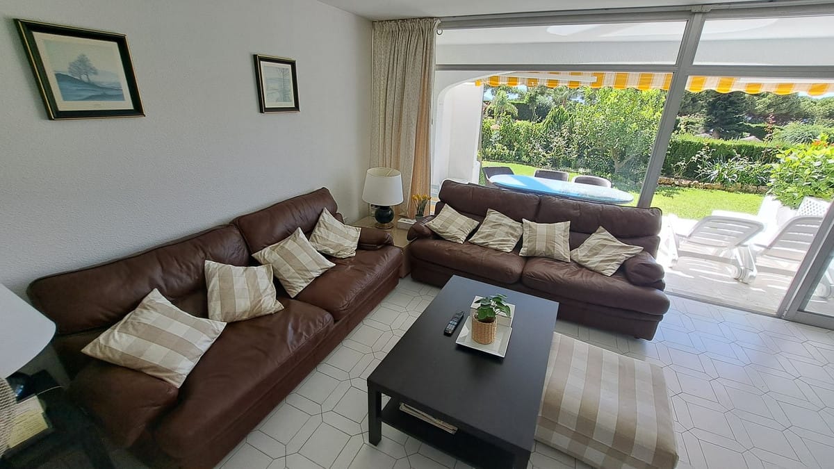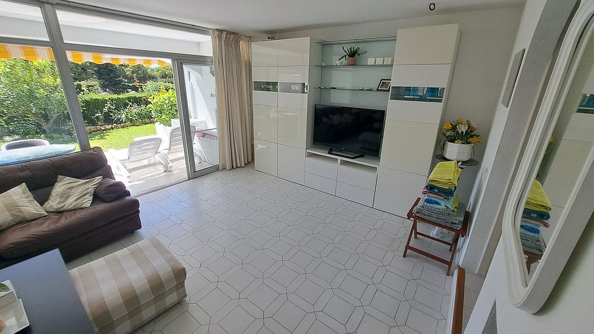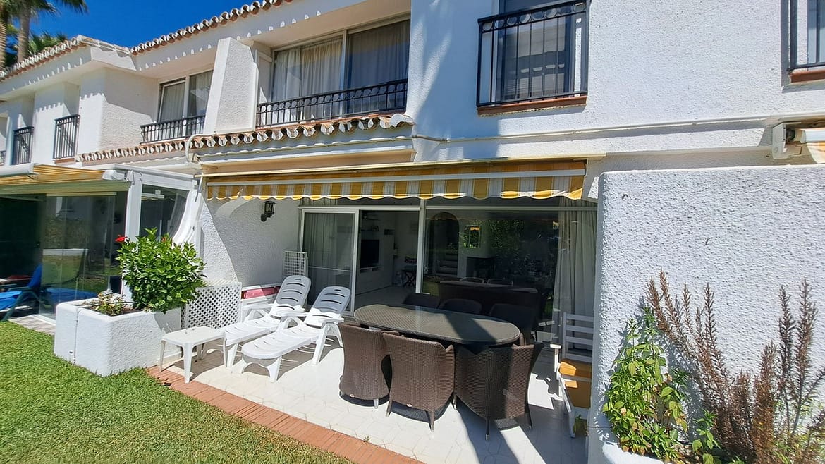 We are delighted to offer this lovely duplex town house in the very convenient location of Miraflores Resort. The property comprises:- Spacious lounge with open fireplace and dining area leading onto large terrace, fully fitted kitchen, master bedroom with en-suite bathroom and dressing room, two further bedrooms, family shower room and cloakroom. Sunny orientation. Lovely communal swimming pool with a bar and restaurant and sub-tropical gardens. Further features includes: additional patio, 24 hours security. Being sold fully furnished. Walking distances to the beach and bus stop.