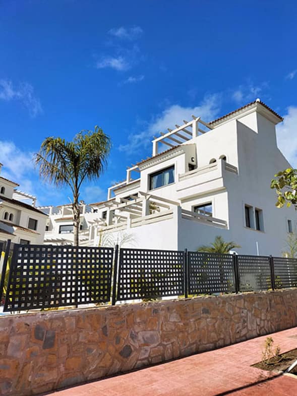A brand new 3 bedroom 3 bathroom townhouse with large basement area. A lovely property located in El Campanario which is famed for its wonderful golf course and club house where you will find a super restaurant, gym, indoor and outdoor pool and spa area along with a hairdresser and beauticians. The development has a salt water pool and an additional pool for children. The house is lovely and bright. There is a large open plan living and dining room with american style kitchen. Doors lead out onto a large East facing terrace where you will have early to mid day sun. On this level there is another terrace at the front that is extremely large in size with a pergola and nice seating area and is West facing where you will get afternoon and evening sun. There is a guest bedroom and shower room on this level.