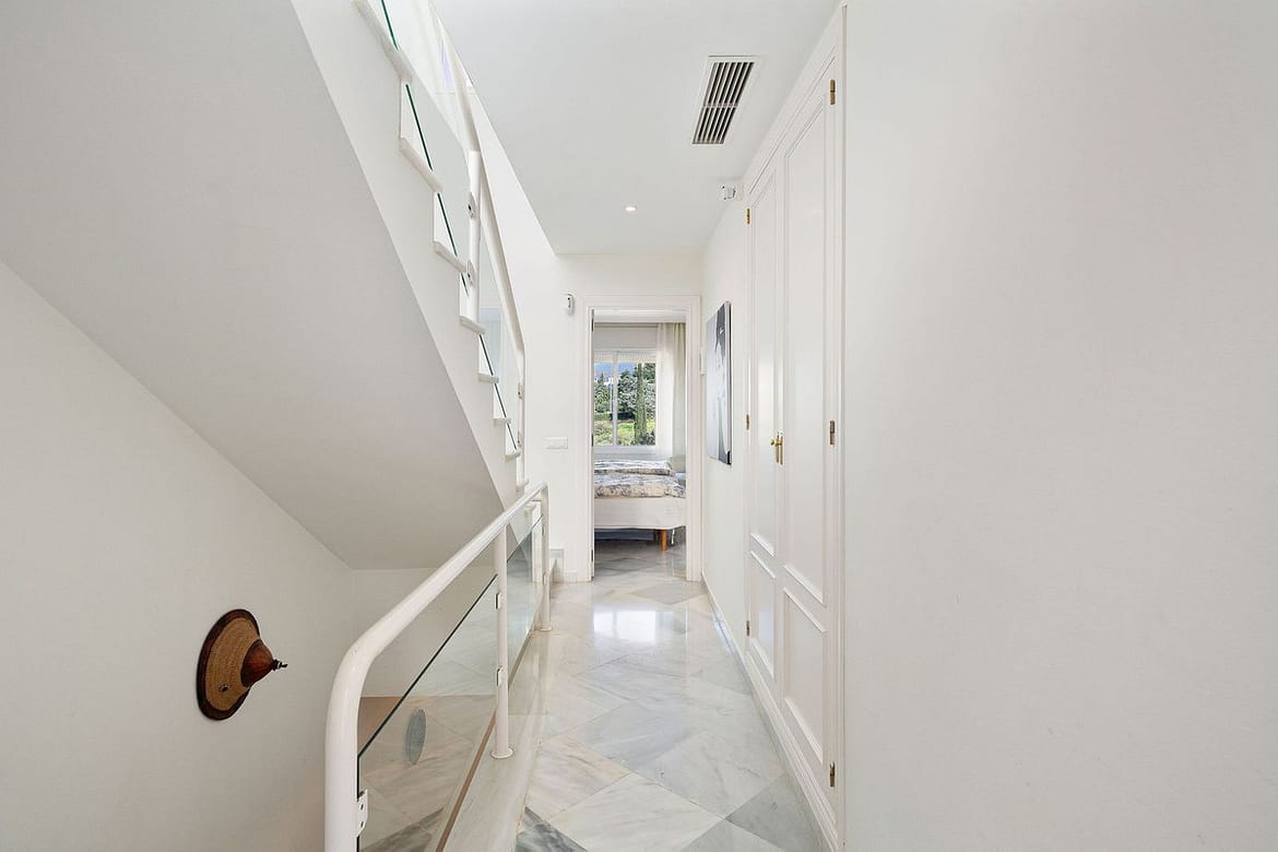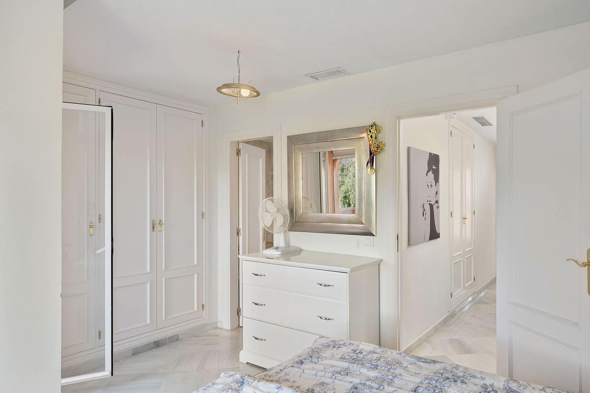 This well presented three-bedroom townhouse spans three spacious levels, combining comfort, space, and a great location in the heart of Nueva Andalucía. A wide selection of restaurants, cafés, bars, and boutiques are within walking distance, while Puerto Banús, sandy beaches, and renowned golf courses are just minutes away. The main floor features a well-sized kitchen with a separate utility room and a split-level dining and living area with an open fireplace. Doors lead to a private terrace with direct access to the communal gardens and swimming pool. All three generous bedrooms have private terraces. The top-floor suite stands out with a large private terrace and an additional terrace with built-in BBQ and open garden views — perfect for outdoor dining and entertaining. Additional features include a private driveway, spacious garage, three en-suite bathrooms, and a guest wc. Located within the sought-after El Palmeral community of just 46 townhouses, residents enjoy two swimming pools, a heated outdoor jacuzzi, sauna, gym, and beautifully maintained gardens in a secure and peaceful setting. A superb opportunity to own a large home in one of Marbella’s most desirable areas.