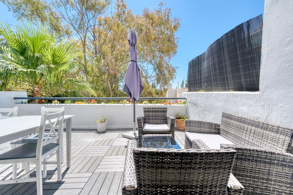 Fabulous townhouse/duplex apartment located within a private community in the centre of Nueva Andalucia, Marbella. This spacious home is accessed via an extremely large community terrace area, which is only used by the owner of this property, which leads to the entrance hallway of the property. Inside, you find a modern design kitchen, dining and living area, along with a guest toilet. The lounge flows directly onto a very private terraced area, large enough to entertain and include several sun loungers, with views to the surrounding green areas. Upstairs, you find three spacious bedrooms, with the master enjoying en-suite facilities, a separate family bathroom and a further extremely spacious and very private terrace with partial sea views. The property also offers two underground private car parking spaces, making this an ideal home or rental investment, where short term rentals are currently permitted by the community. The property was completely refurbished in Q4 2023, including a new kitchen, bathrooms, new windows, new air-conditioning, new terraces and upgraded electrics, plus the current owner has paid towards a community fund which is due to start repainting the entire community in the coming weeks. Contact us now!