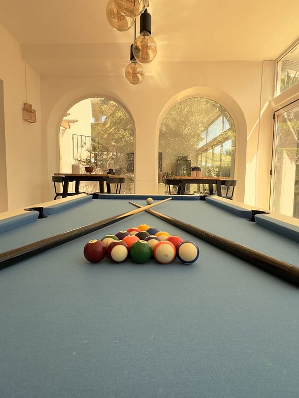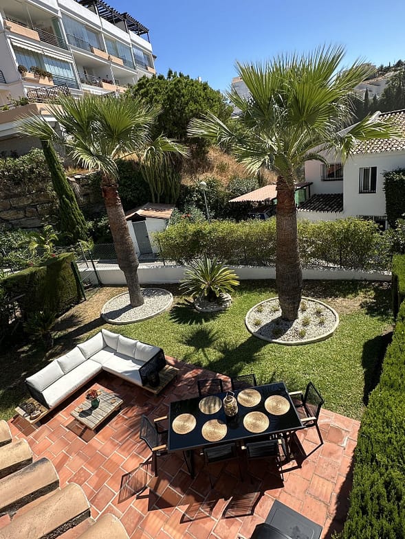 The sun soaked private garden has 2 terraces which lead to a lawned area with mature palm trees – all maintained by the community gardeners.