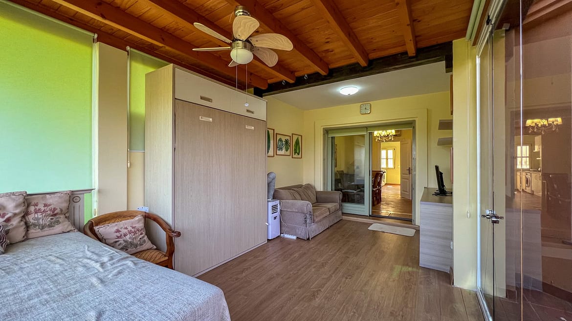 Inside, the property features a fully fitted kitchen, an open-plan living and dining area that connects seamlessly to the private terrace and garden, and a covered porch area that can function as a fourth bedroom. All three bedrooms are en-suite, with the top floor offering a nearly independent suite including a spacious bedroom, dressing area, en-suite bathroom, and private terrace – ideal for family privacy or guests.