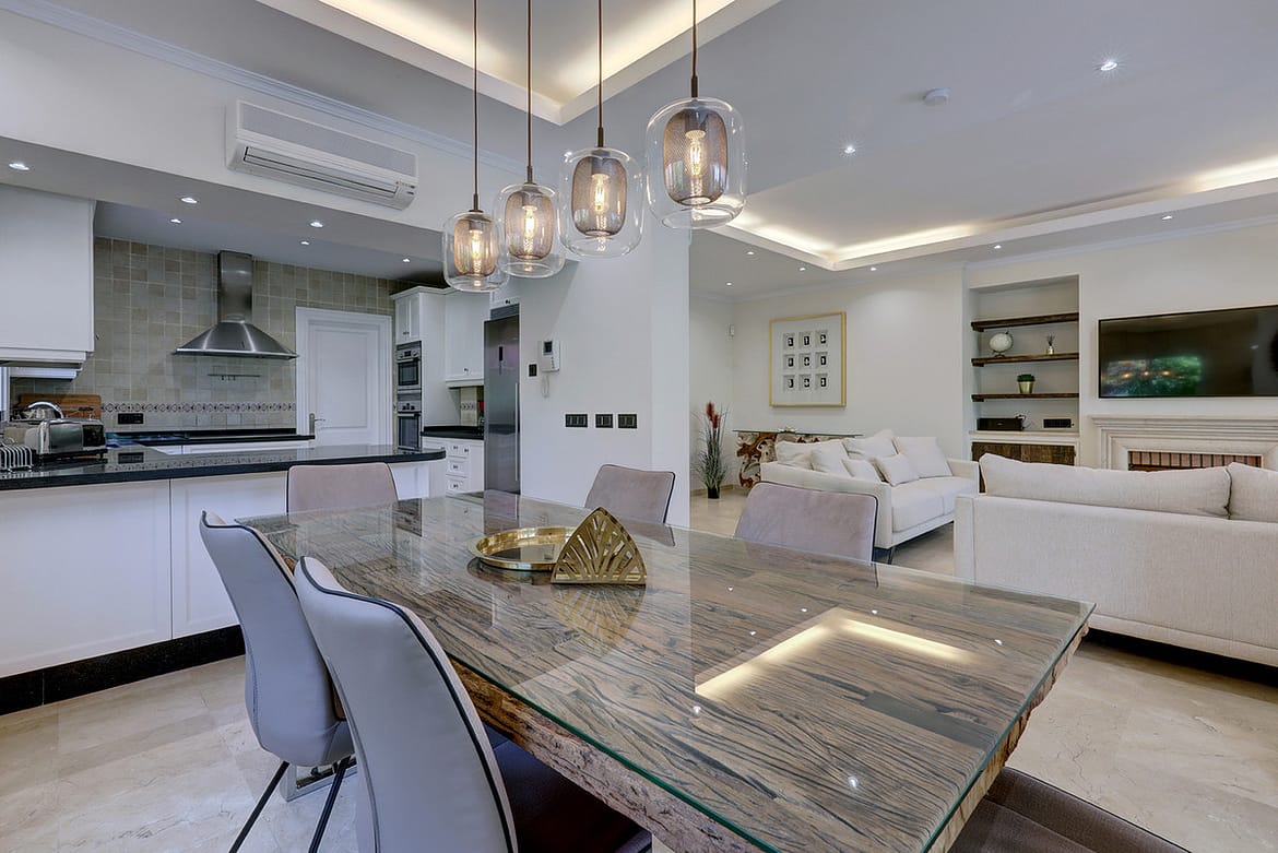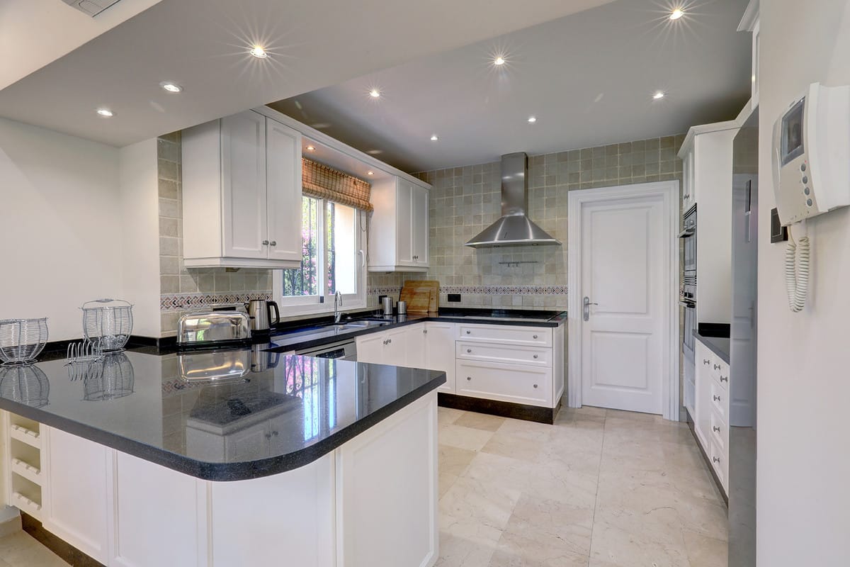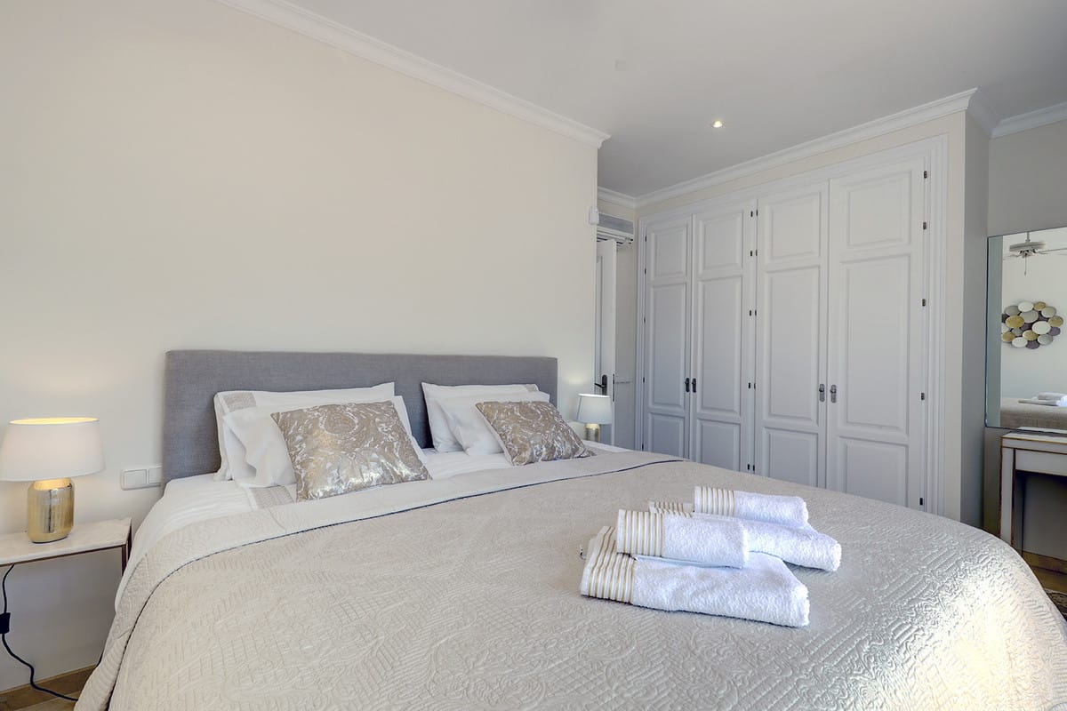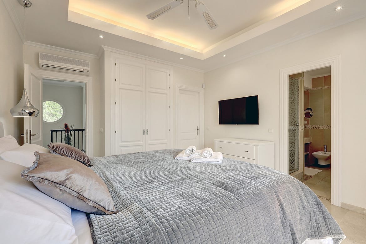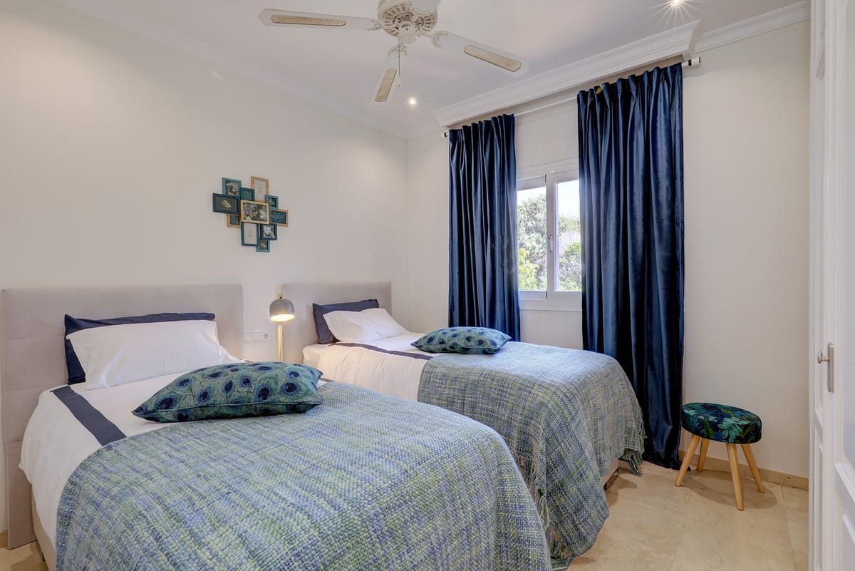 The villa’s interiors are bright and sophisticated, featuring high ceilings and expansive glass doors that fill the rooms with natural Andalusian sunlight. The brand-new kitchen is equipped with high-quality appliances for all your cooking needs. All four bedrooms are spacious, with two main bedrooms featuring en-suite bathrooms. Additionally, a cozy mezzanine doubles as an office, complete with a sofa for those seeking a quiet reading spot.