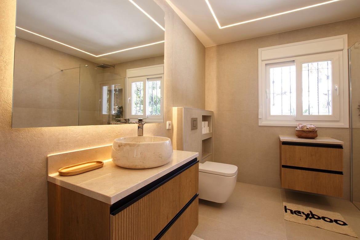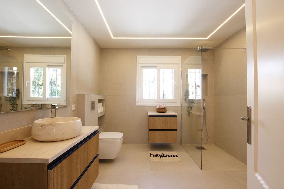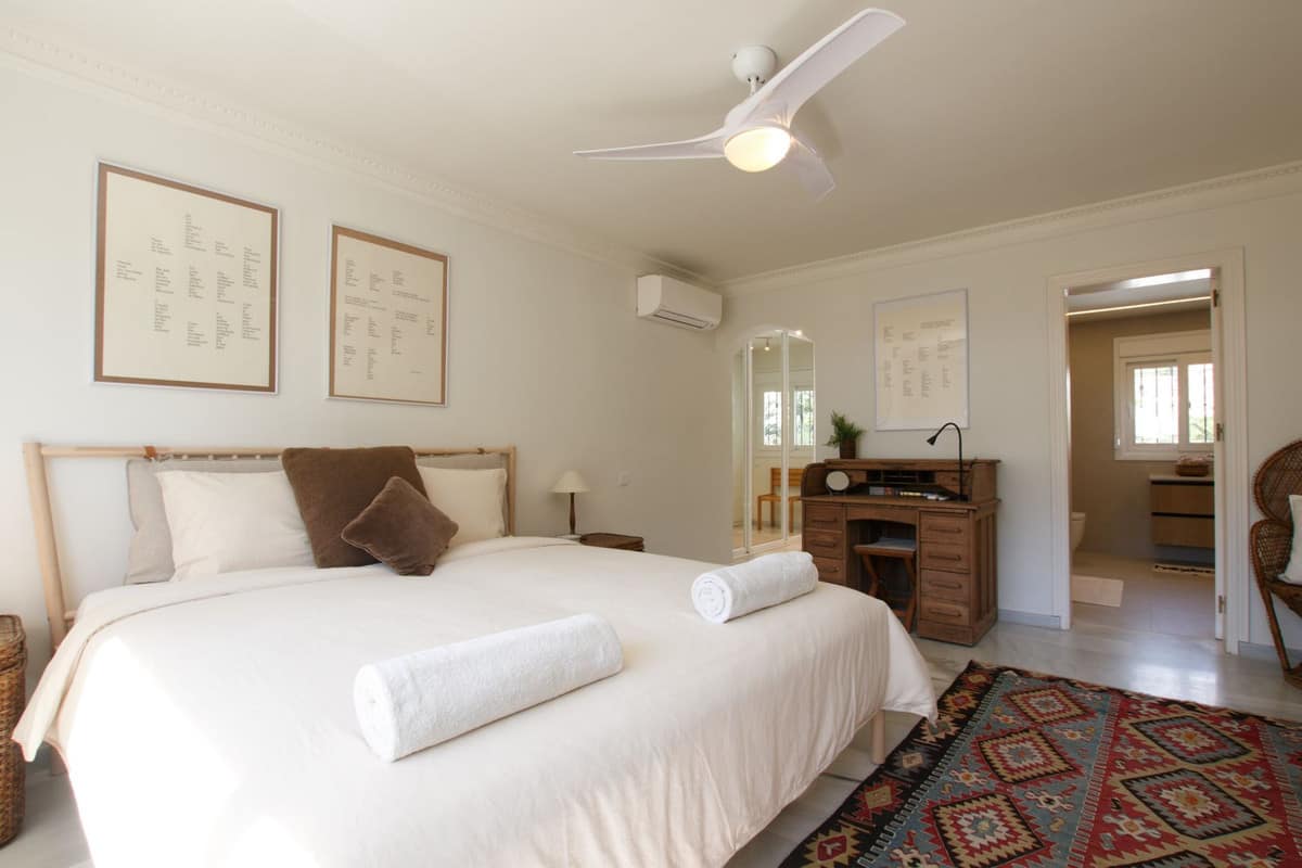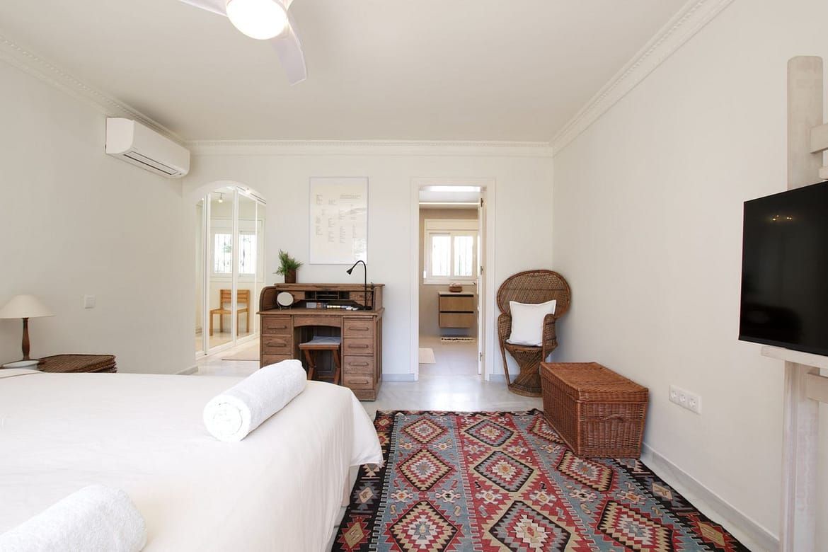 The master bedroom is wide ad with some partial sea views, facing south. From the new good quality PVC window you can overlook the private garden and the pool. The shutters are automatic. Also there is a walking closet with a window and automatic shutters. The fourth bedroom has 2 single beds and some partial sea views. These 2 bedrooms on the first floor share a bathroom. This spacious bathroom has been completely refusbihed in a modern minimalistic style and has a walk in shower. It is exterior with a window and the shutters are electric.