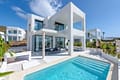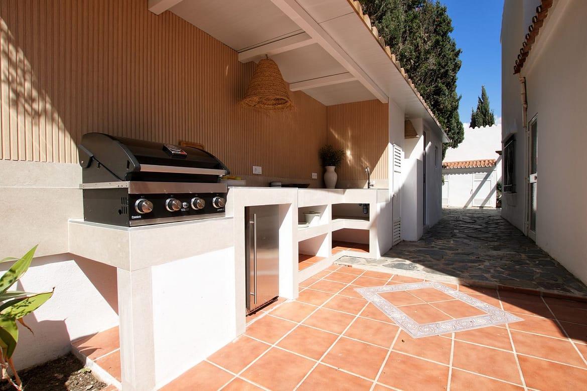 In the living room area, there are 2 large sofas (one of them is a sofa bed), a smart TV and a direct exit to the outside terrace and the garden. On the terrace of the house there is another dinning table with 10 chairs, several sunbeds, a chillout sofa, exterior kitchen with a barbecue, a fridge and a sink and also a full bathroom with a shower. On the ground floor there are also 2 exterior bedrooms with wardrobes and 1 full bathroom with a bathtub.