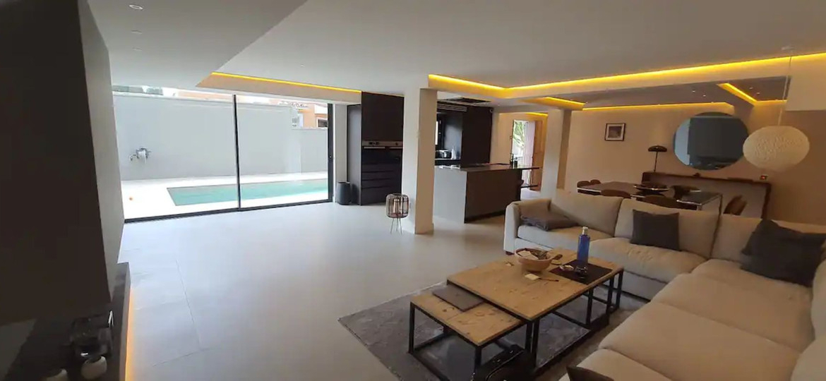 The large living room is also on the ground floor , with an open plan kitchen, a fireplace and direct access to the private terrace with pool.