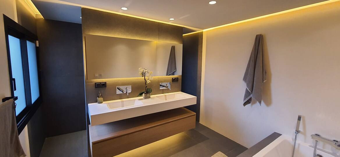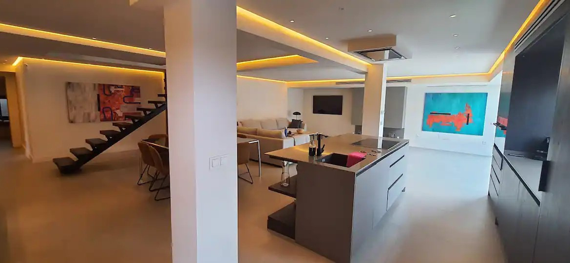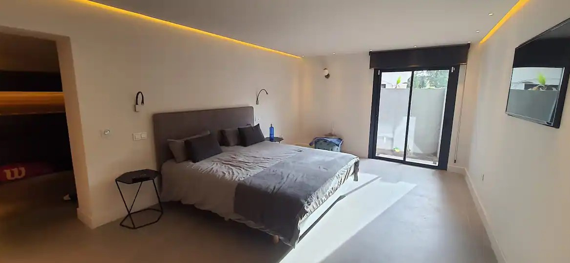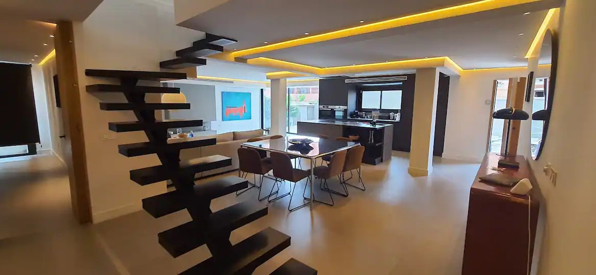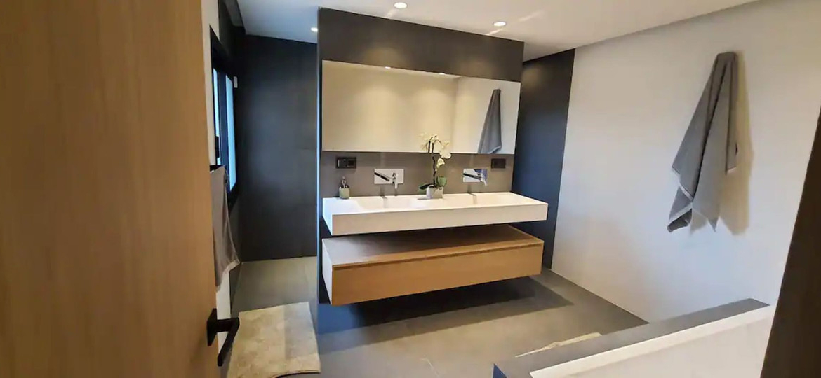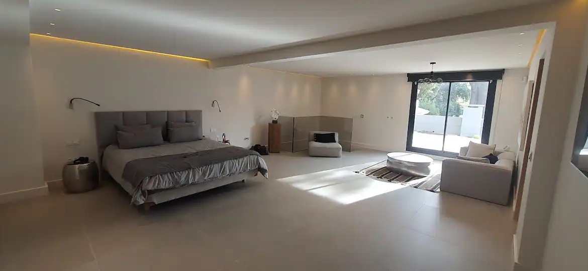 On the first floor there is a spectacular 60m2 master bedroom, with en.suite bathroom and a walk-in wardrobe. From the master bedroom there is access to a terrace and to the solarium on the top floor, with sea and mountain views. The complete house is tiled with large Italian stone tiles, has tick oak doors with concealed hinges and a fully fitted kitchen with Bosh appliances.