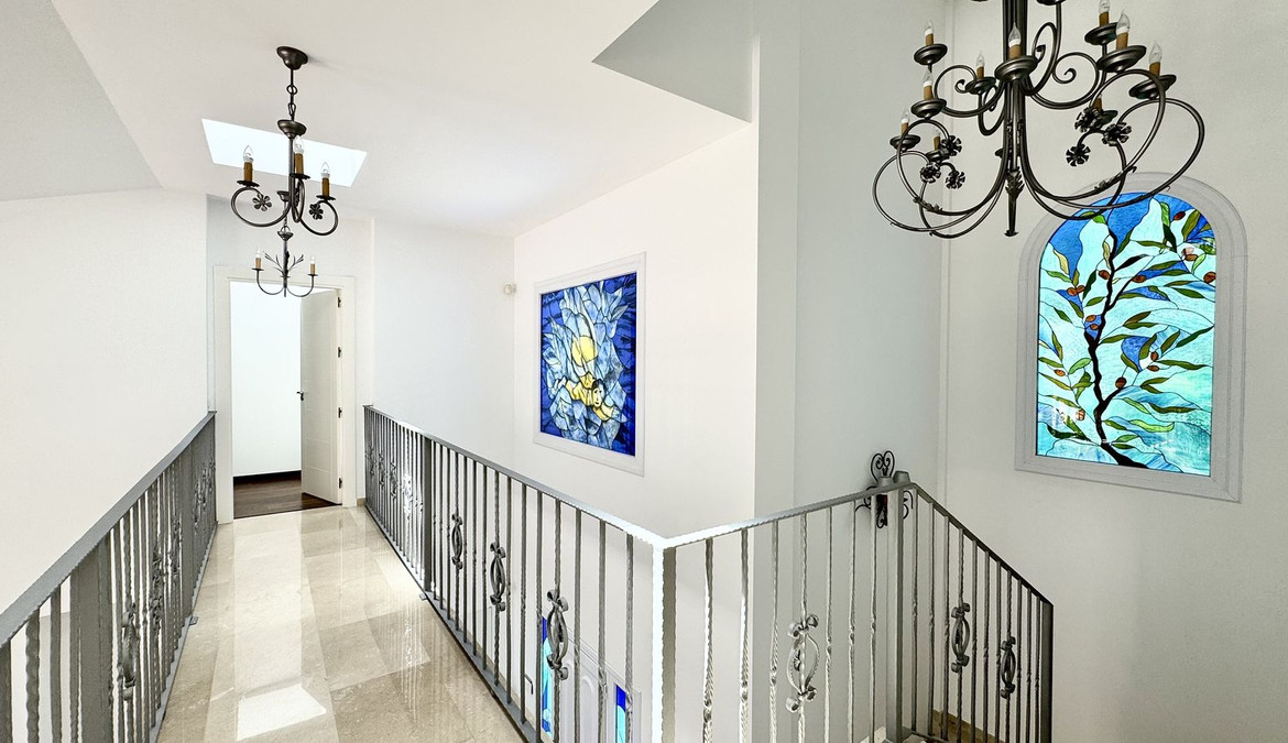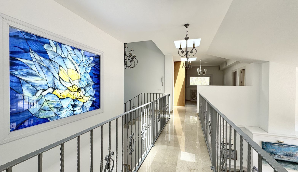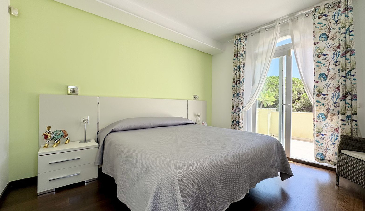 This elegant villa, built in 2014, is located just 250 meters from the sea in one of the most prestigious areas of the coast. The property has never been rented out and is in immaculate condition. It boasts a stylish, bright interior with large stained-glass windows and beautiful open views.