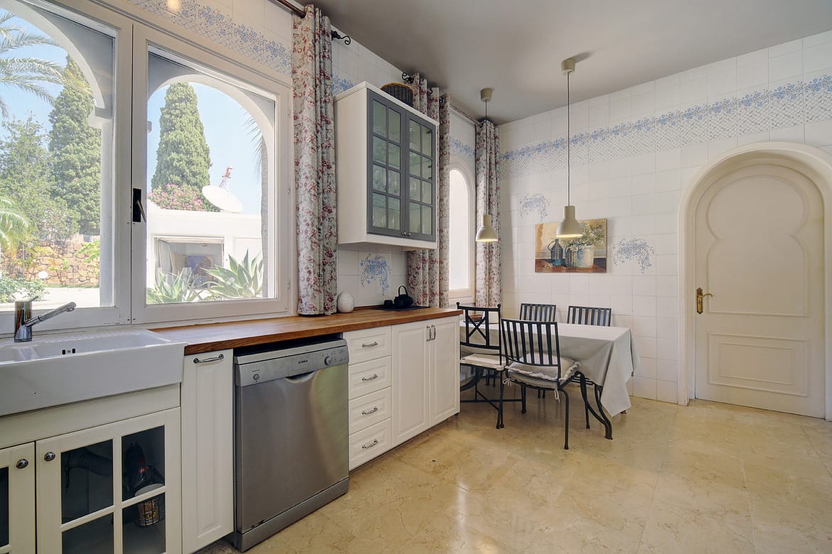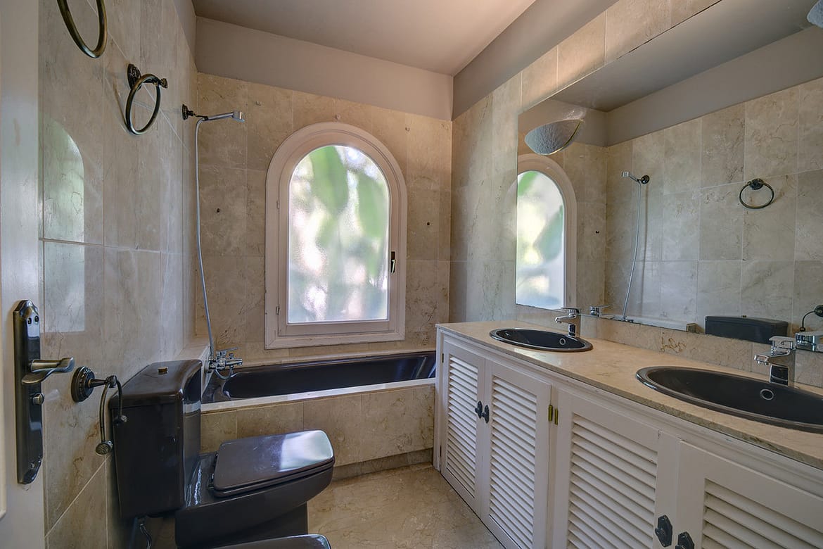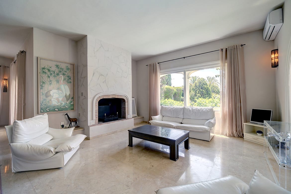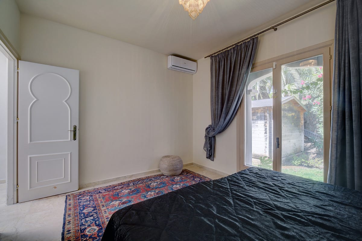 Inside, the property is defined by its elegant details and superb condition. The marble floors add a touch of sophistication, complemented by glass doors that invite natural light into the spacious living and dining rooms. The fully fitted and equipped kitchen is both functional and stylish, ideal for keen cooks. Additional conveniences include air conditioning, a fireplace for cooler evenings, fitted wardrobes throughout, and a laundry room to ensure practicality. The villa is offered unfurnished, allowing new owners the flexibility to tailor interiors to their own style.
