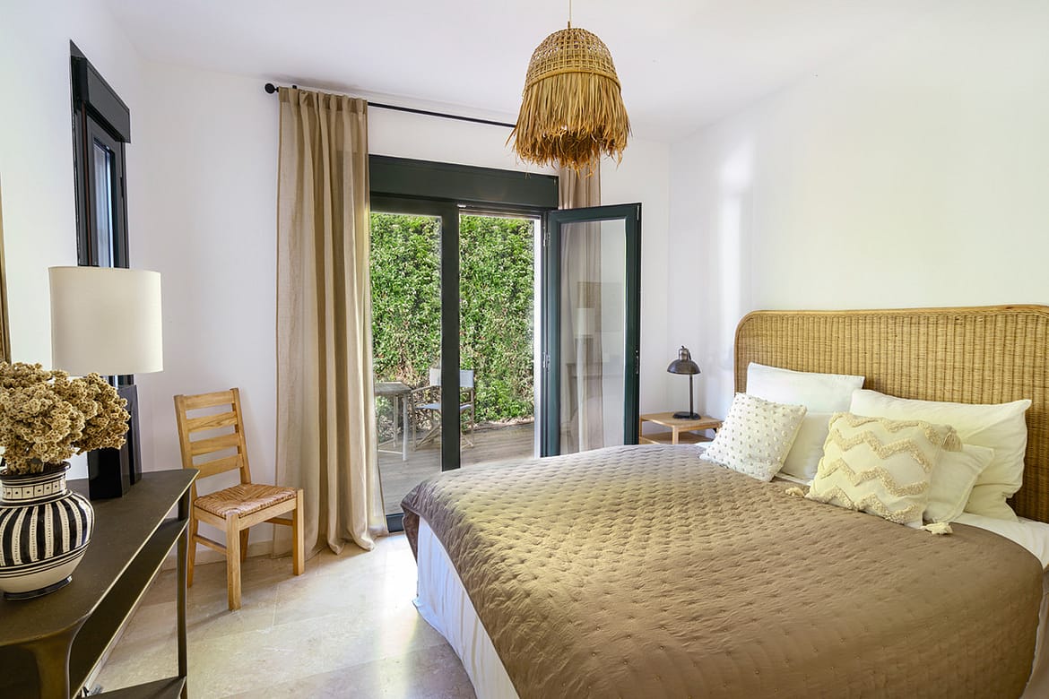 On the ground floor from the hall there are two bedrooms. One of which is a spacious king size bedroom, leading on to a west facing terrace and complimented with its own En-suite bathroom. There is also a southerly aspect patio doors with a pool view.