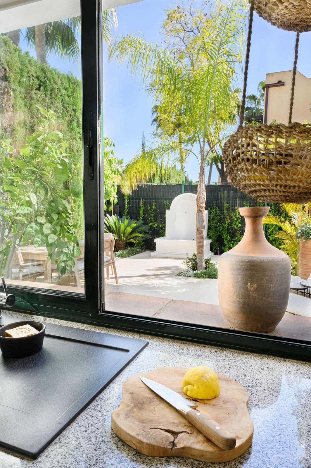 The lounge is adorned by natural lights, since there are both patio doors and windows on both sides, the room is radiant and enhanced with views to the garden and pool. The crisp white walls are softened by carefully selected pieces and soft furnishings. Leading out from the lounge to the sprawling terrace, where both dining areas and soft seating areas offer the perfect space to embrace the 320 days a year sunshine that Andalucia has to offer. Perfect for dining al fresco or sipping your favourite tipple, watching the sun set. The pool is complimented with sun beds, for soaking up the rays.