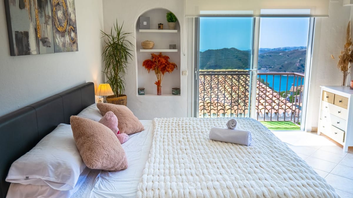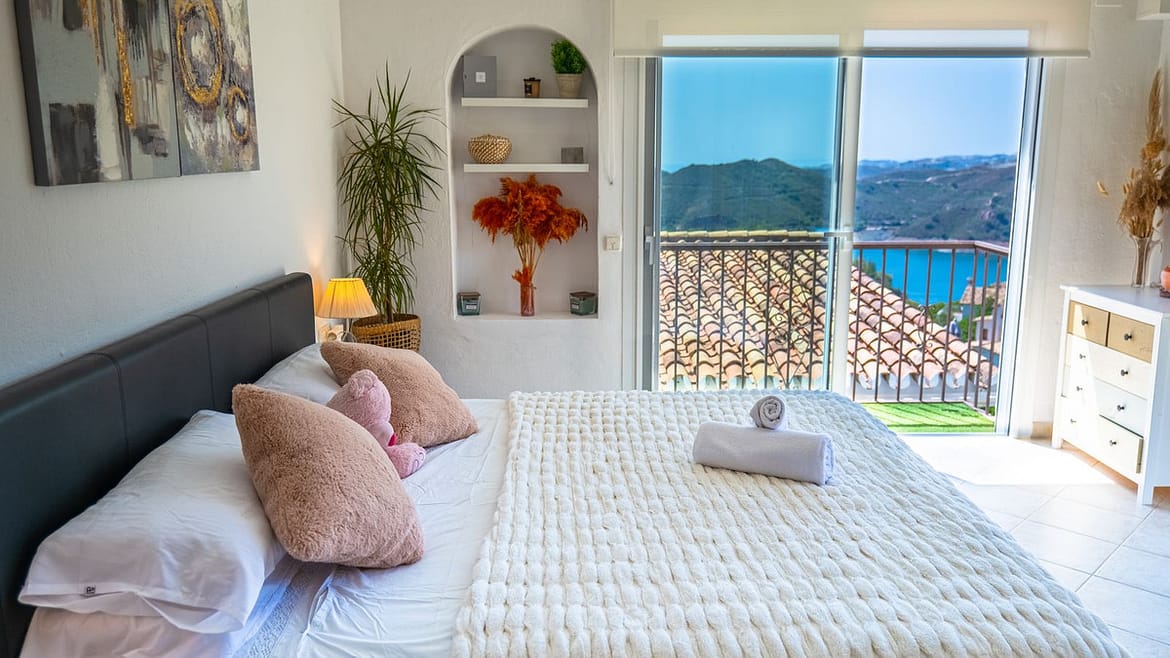 The master bedroom is very spacious & bright, with beautiful panoramic sea and lake views. There is a separate garden leading from this bedroom patio. It has en-suite bathroom with 2 wash basins.