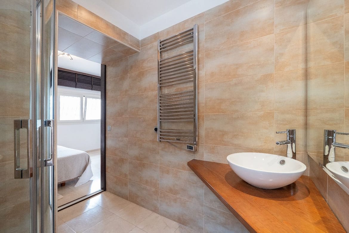 The fully equipped kitchen includes all necessary appliances, seamlessly connected to the dining area for effortless entertaining. The villa includes a separate laundry room with washing and drying machines, two boilers ensuring ample hot water supply, and a heated pool for year-round enjoyment.