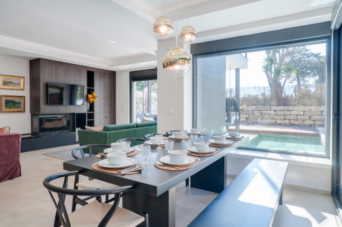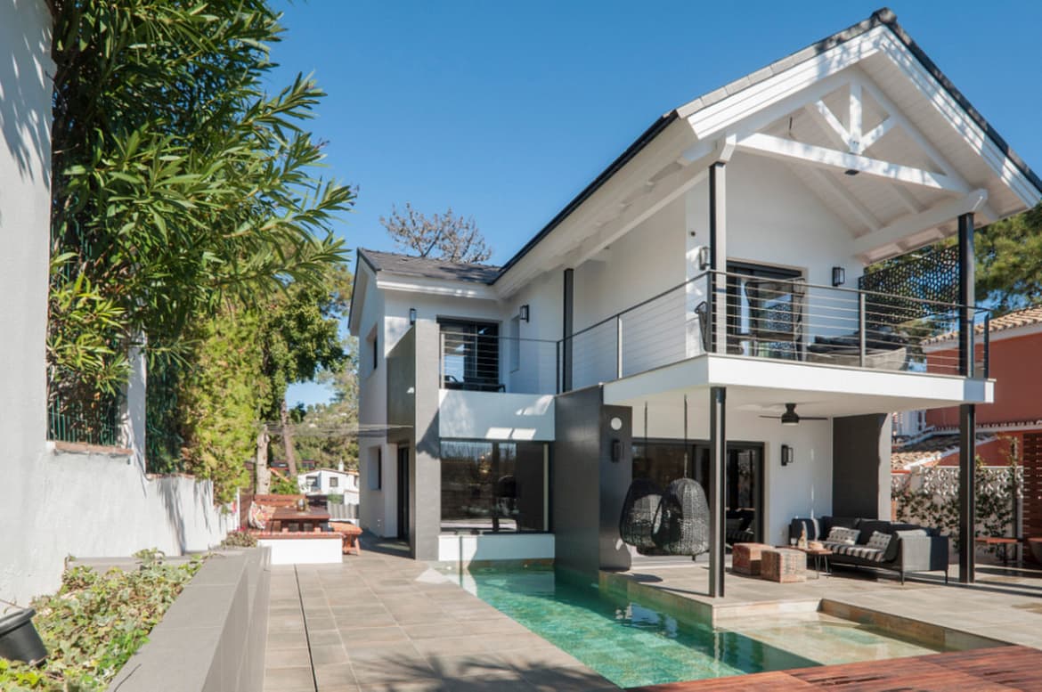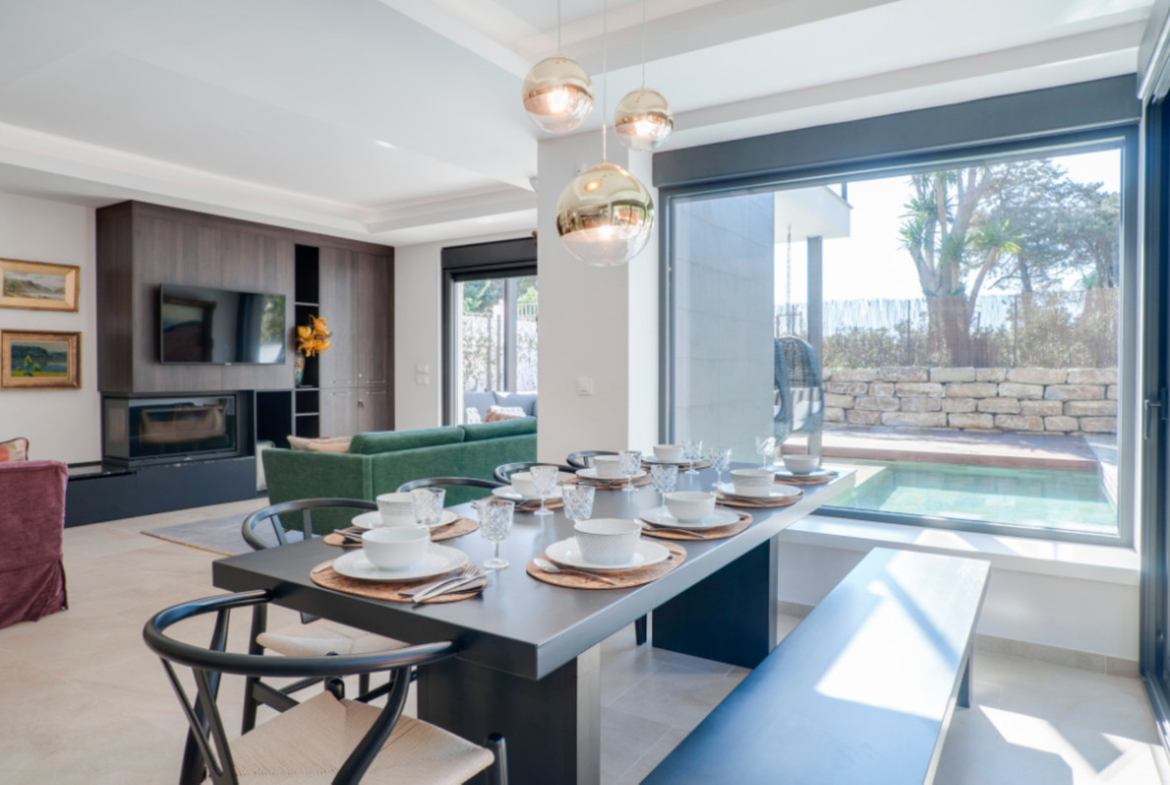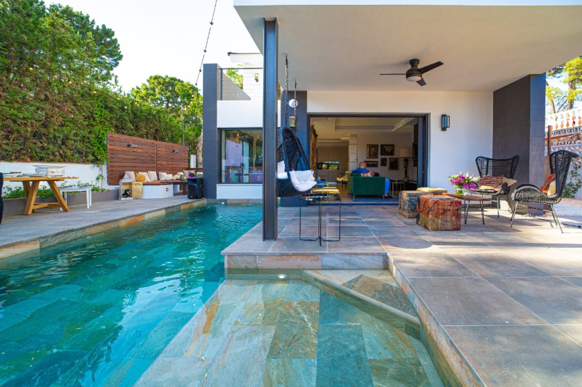 Tucked away in the leafy suburbs of Artola Baja in East Marbella, Ligera is a supremely stylish and spacious villa with a unique design, ready to welcome its lucky guests! This is a dream home for both relaxation and entertainment, with an ample garden and pool terrace, spacious open-plan living and dining areas, all brand new and very tasteful. The huge set of floor-to-ceiling patio doors seamlessly connects inside and outside for plentiful lounging, dining and entertaining options.