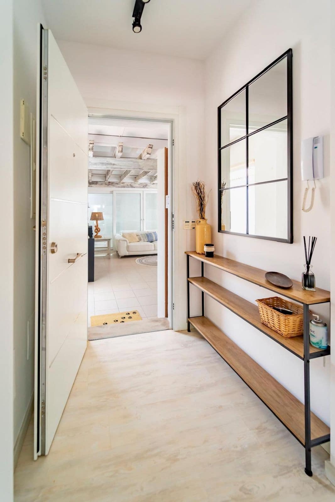 Upon entering, you are greeted by a spacious living area. The kitchen, which opens onto a terrace, is perfect for outdoor dining and entertaining.