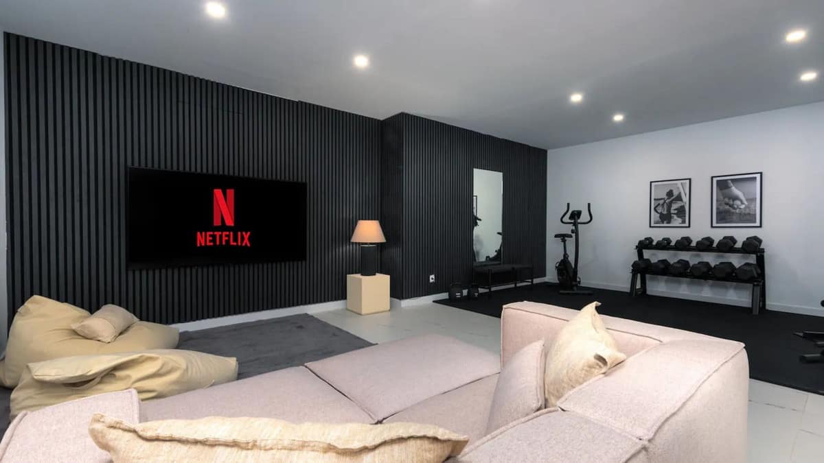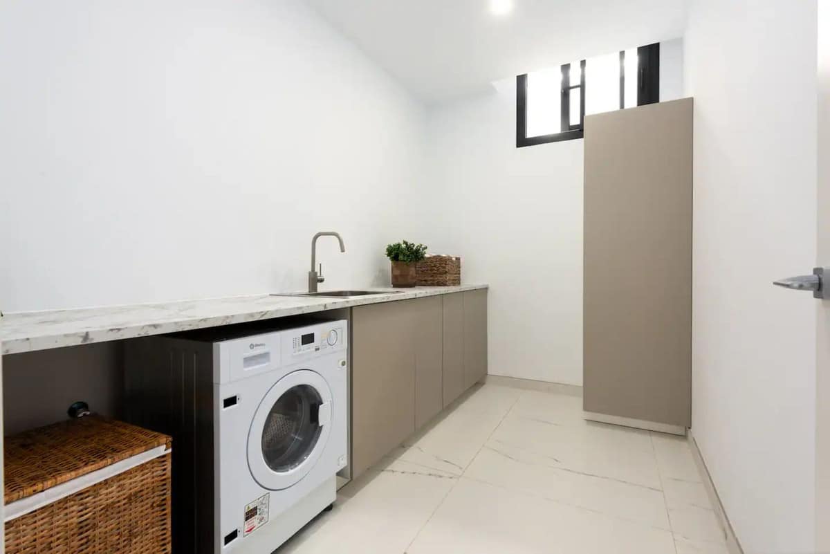 The basement also offers a state-of-the-art cinema room for movie nights, a gym for staying active, and a practical laundry room.