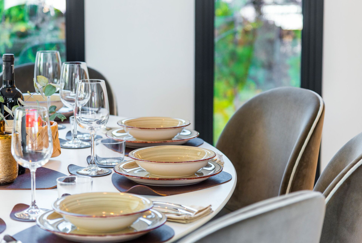 At the entrance of the property you are surrounded by the gentle splashing of the infinity pool. The large terrace offers a cozy lounge as well as a large dining table. Sunloungers invite to linger at the pool side. In the back of the garden a rustic BBQ promises long summer evenings while being enchanted by the twinkling water. The pool – which can be heated in the cooler months – is equipped with a counter current and has a large Jacuzzi area. It’s amazing depth of 4 meters and its large aquarium window allows you to swim by those chilling in the cinema room in the basement.