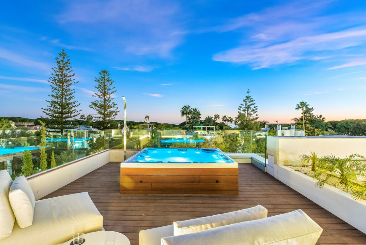 The solarium on the roof top terrace will be one of your favourite spots to enjoy the mornings or evenings! It offers another Jacuzzi, a large lounge area, an inviting Bali bed, an outdoor kitchen and a bar dining area. Surrounded by Mediterranean plants you enjoy seaviews up to Gibraltar.