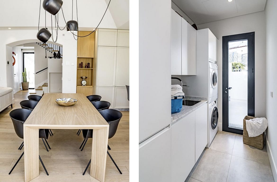 Upon entering, you are welcomed into a warm and inviting living space, thoughtfully designed with an open-plan layout. The main living room with fireplace flows seamlessly into the dining area and a sleek, fully equipped kitchen, creating a bright and social atmosphere. The interiors are tastefully decorated in a fresh, contemporary style, with an emphasis on natural light and effortless indoor-outdoor living.