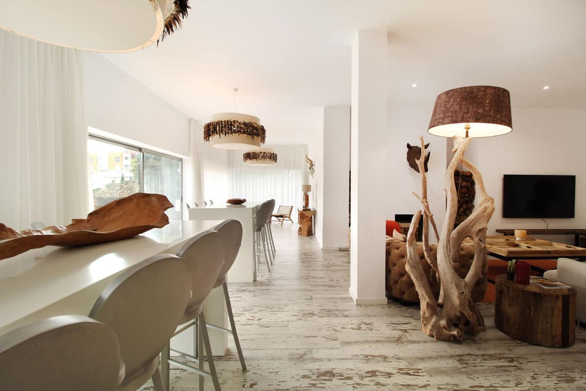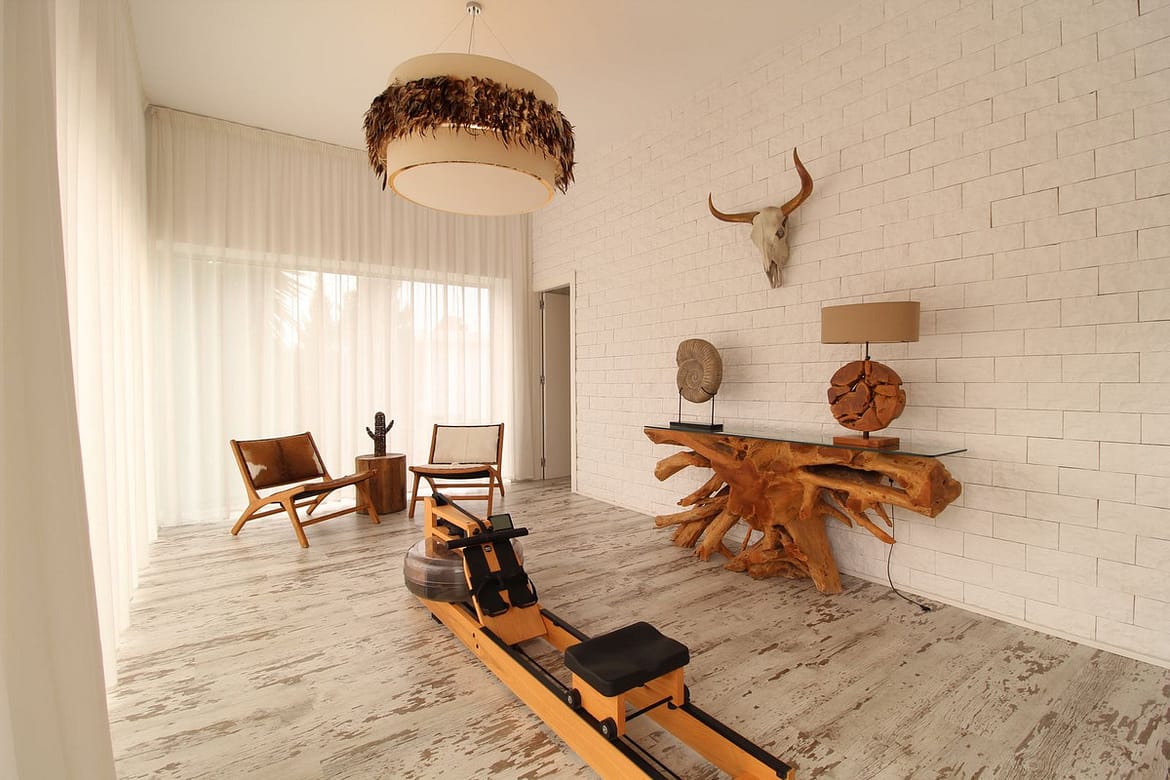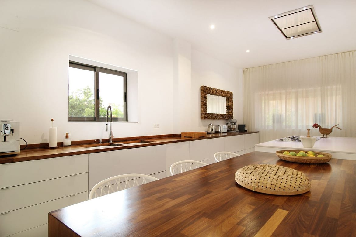 As you enter the welcoming hallway, you are immediately struck by the sense of openness, with the living area unfolding before you. To your left, the beautifully designed open kitchen exudes a natural Ibizan charm, a theme echoed throughout the villa.