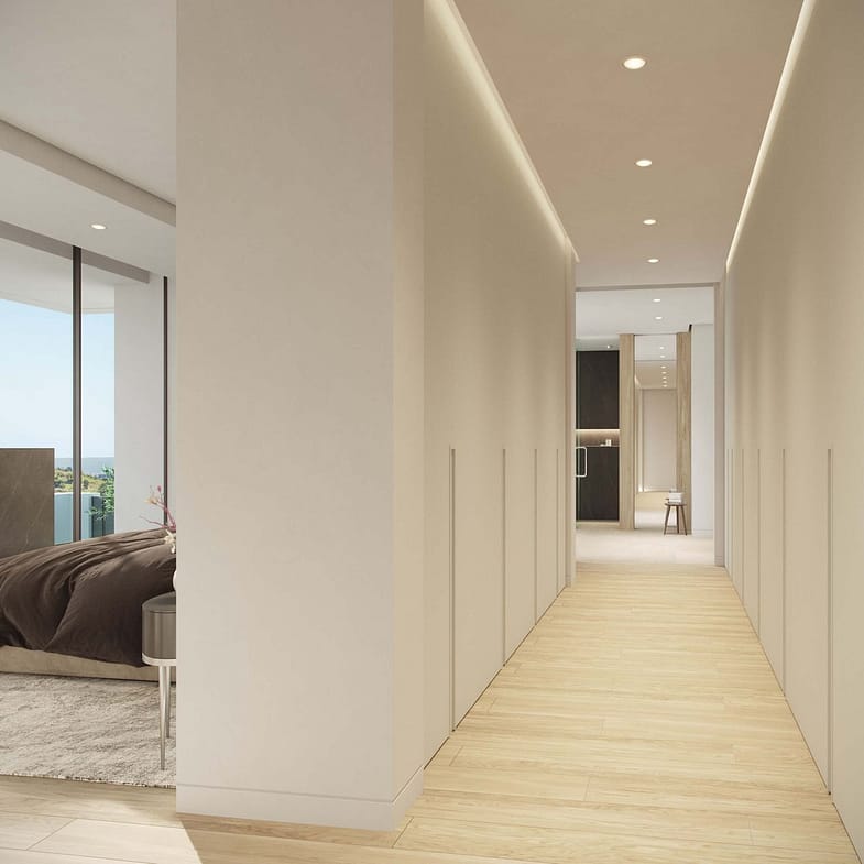 Lastly, the upper level consists of the Master bed- & bathroom, with an indoor area of 84m2 and adjoining 127m2 terraces. From these terraces you can enjoy your built-in Jacuzzi, semi-covered chill-out area through a built-in bioclimatic pergola.
