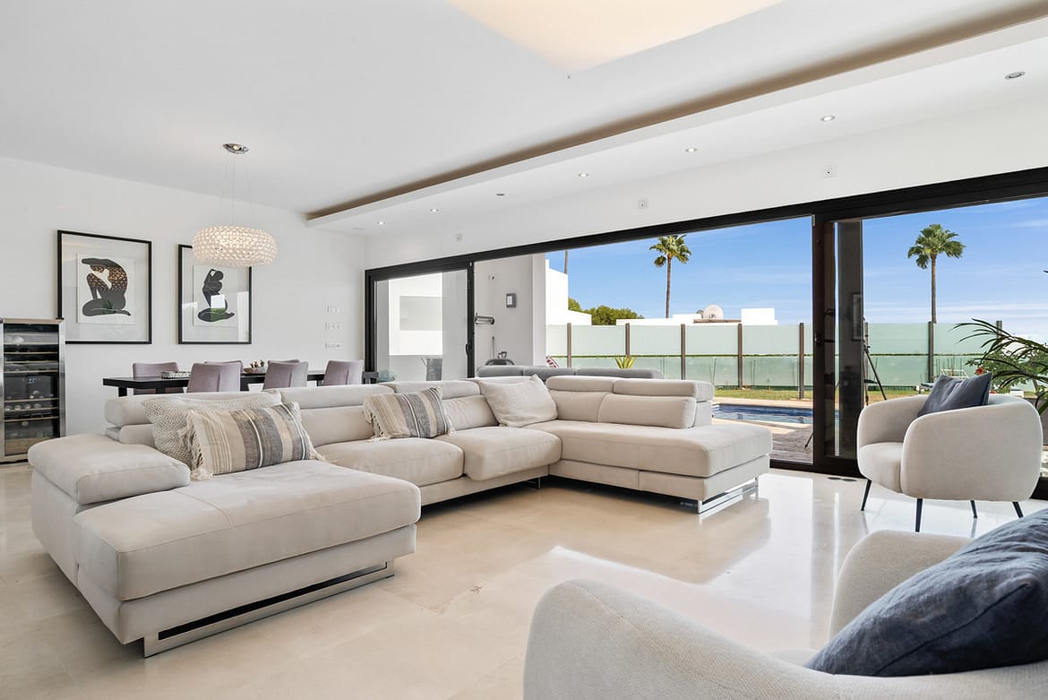 The interior comes fully furnished, showcasing a sleek, fully fitted kitchen, a bright dining room, and an inviting living area. Floor-to-ceiling glass doors flood the home with natural light while framing panoramic vistas of the sea, mountains, golf course, and surrounding greenery. Enjoy unobstructed views stretching across the coastline — a spectacular setting for entertaining or sunset cocktails.