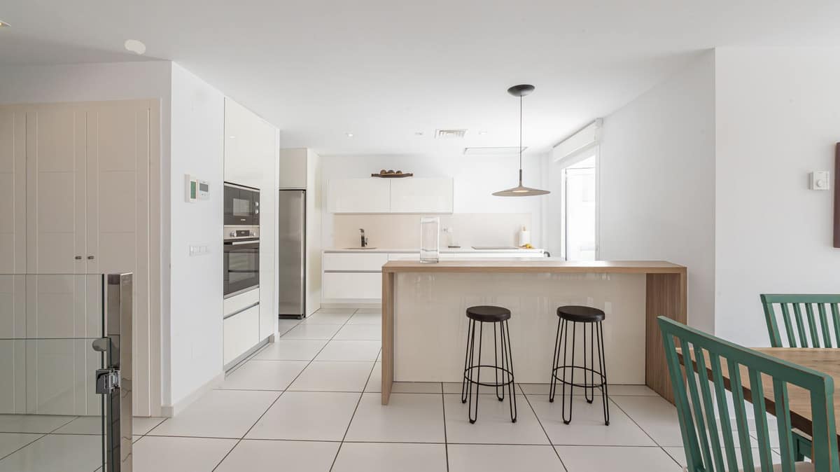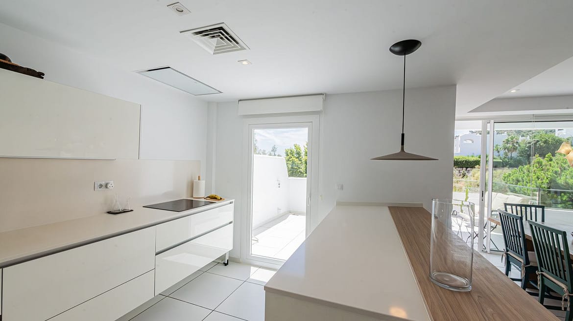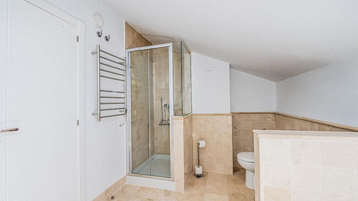 The villa is distributed over 3 levels, all connected by a private elevator. It has 4 bedrooms, all with en-suite bathrooms, plus a guest toilet. The master bedroom features a fantastic walk-in wardrobe, large terraces, a fully equipped kitchen, and a laundry room.