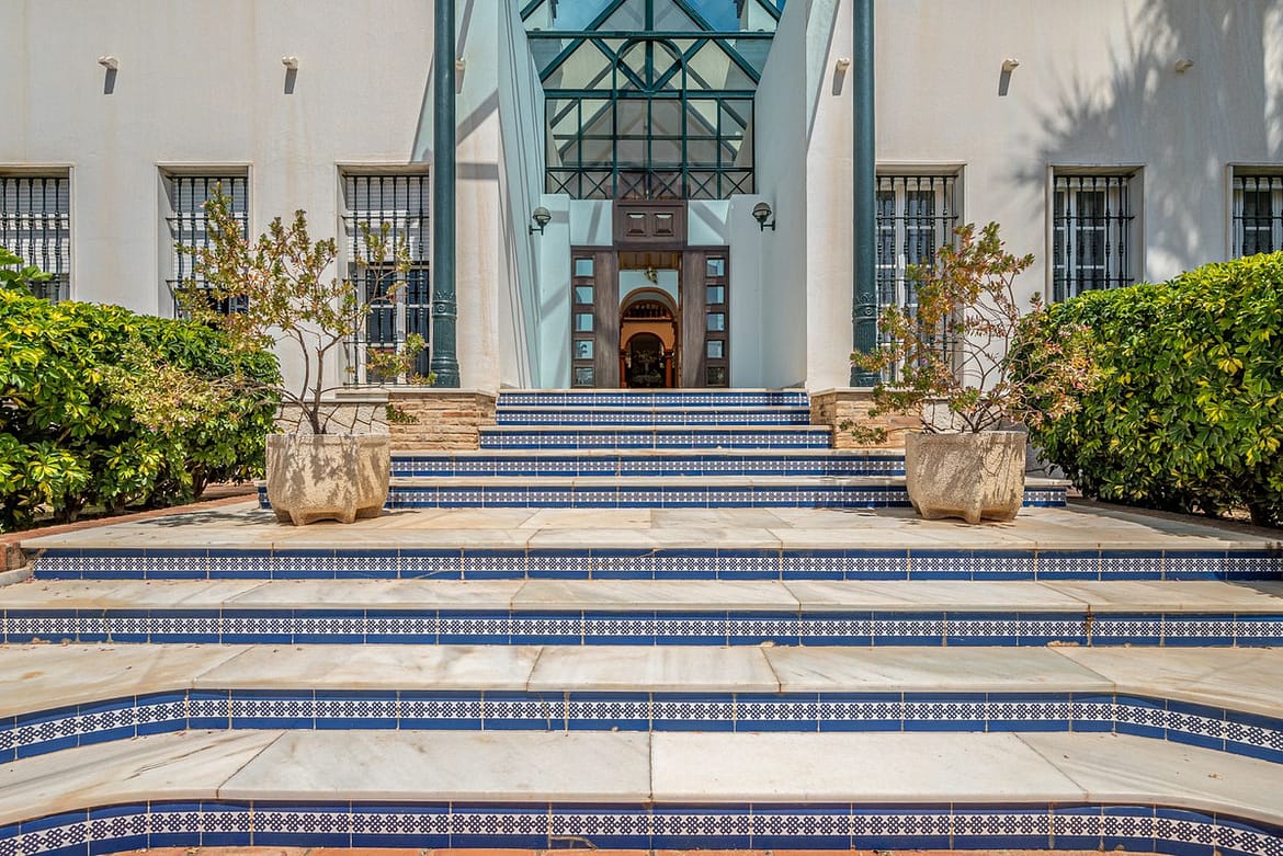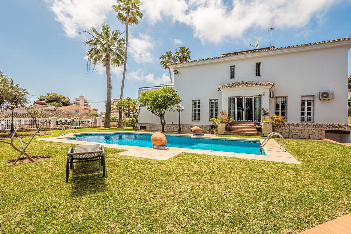 Magnificent Villa for sale with pool and private garden very close to the beach near the Puerto Marina in Benalmádena Costa. It is a villa with personality and its own style. Contemporary architecture on the outside joins with the Andalusian style to enjoy the Malaga climate throughout the year. The villa has 4 bedrooms with bathrooms en suite, two bedrooms with terraces of about 40 m2 each with sea views, dressing room, separate kitchen, dining room, large living room, Andalusian patio, basement with kitchen and guest room, sauna. The house has a private garden with palm trees, a private pool, a rest area with barbecue. Underground parking for two cars and open parking for two more cars. Near the villa there are shops, supermarkets, train station. 15 minutes walking to the beach.