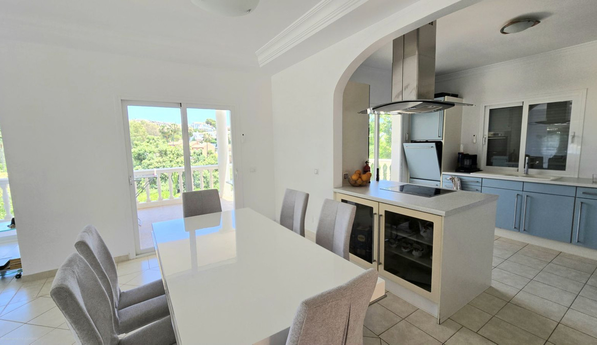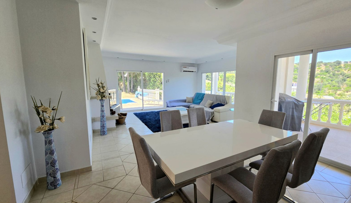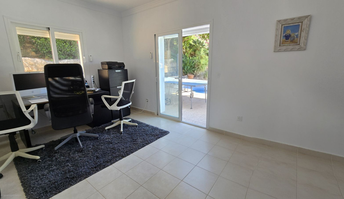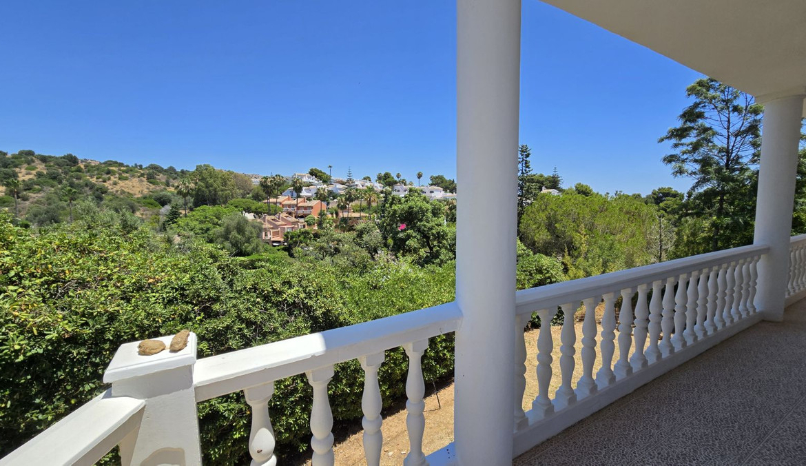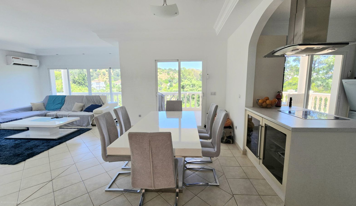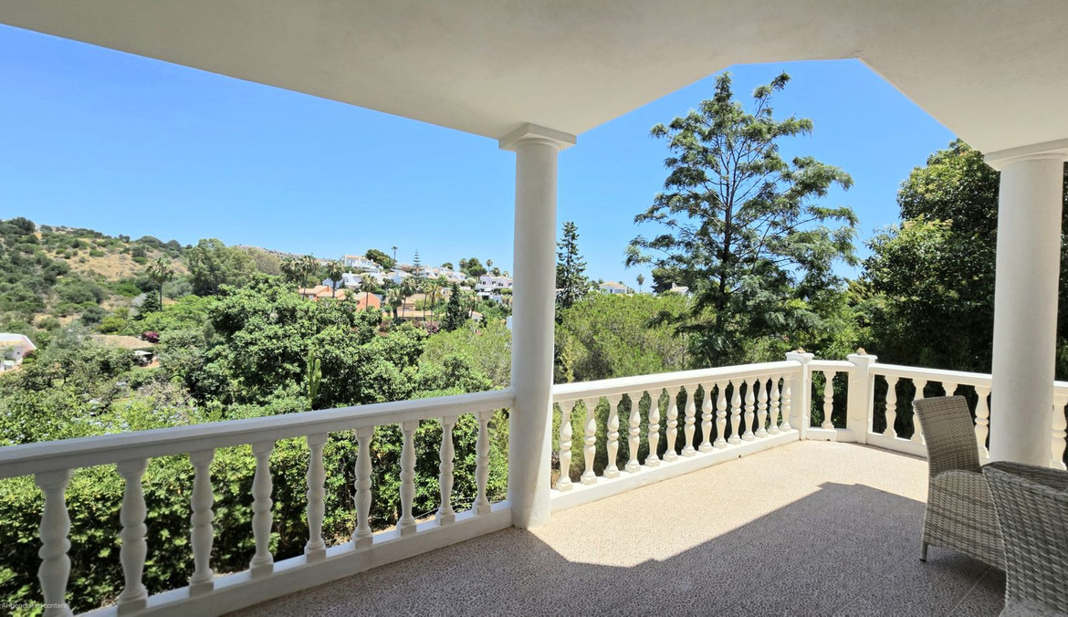 UP A WIDE GLASSED SHORT STEP STAIRCASE YOU FIND 3 VERY LARGE BRIGHT BEDROOMS, ONE BOASTS A LARGE ENSUITE BATHROOM, ALSO A GUEST BATHROOM SERVES THE REMAINING 2 BEDROOMS. AGAIN ON THIS FLOOR IS A LARGE WRAP AROUND TERRACED, ACCESSED THROUGH SLIDING DOORS FROM EACH ROOM, WITH ELEVATED PLEASENT VIEWS OF THE POOL, GARDEN AND GREEN AREAS AND MOUNTAINS.