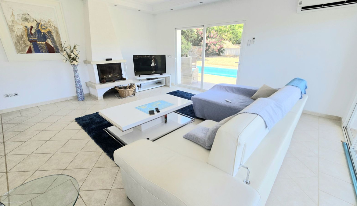 THE LIVING AREA IS TASTEFULLY DECORATED, WITH WRAP AROUND SLIDING DOORS GIVING LIGHT, LEADING TO A LARGE TERRACE SURROUNDING THIS FLOOR WITH AMAZING VIEWS OF THE POOL AND GARDENS.
