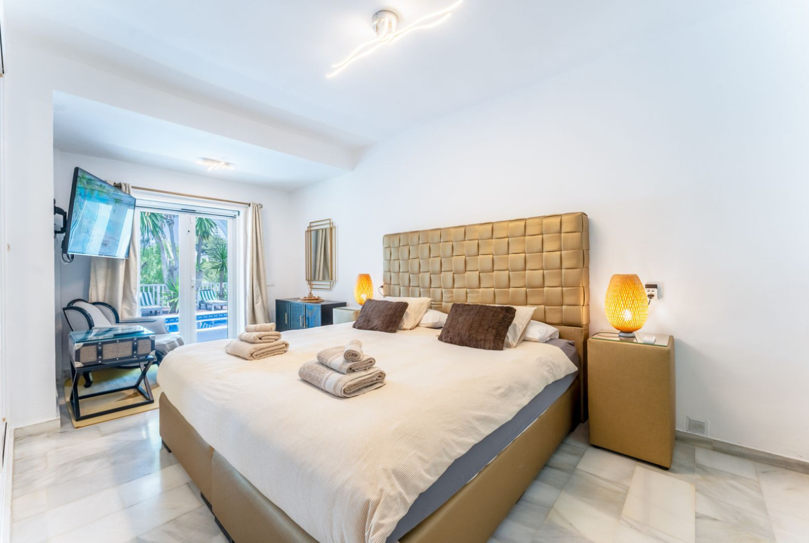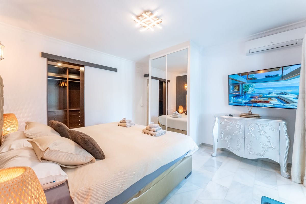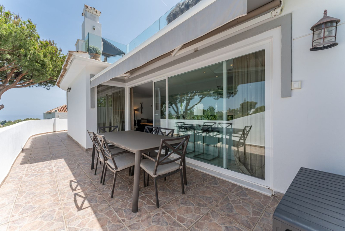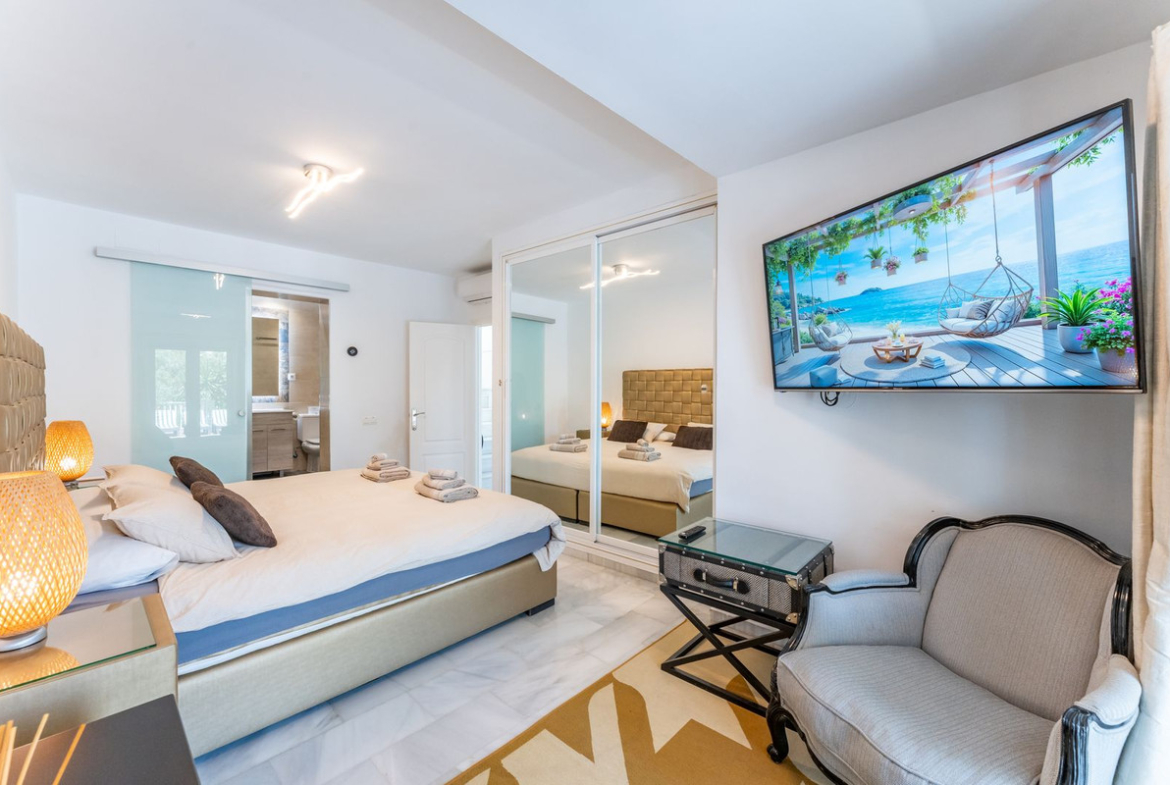 Stunning luxury villa located in the lower part of Calahonda, in an exclusive cul-de-sac surrounded by villas and in a very quiet residential area, just 800 meters from the beach, close to a beautiful natural green area of Calahonda, with breathtaking panoramic views of the sea and mountains. The property sits on a 715 m² plot and offers 232 m² of interior space plus a 70 m² terrace, fully enclosed, equipped with an alarm system and a private garage. The villa features four elegant bedrooms with king-size beds and en-suite bathrooms, marble floors throughout the house, double-glazed PVC windows and doors that provide exceptional natural light in every room. The furniture has been carefully selected and stands out for its sophisticated style and high quality. There are two dining areas — indoor and outdoor — perfect for entertaining. Outside, you’ll find a large heated swimming pool with wooden decking, sun loungers, a chill-out area, and open views that invite absolute relaxation. On the rooftop, the spacious solarium offers a fully equipped bar, barbecue area, jacuzzi, and bar stools — ideal for enjoying unforgettable sunsets by the sea. Additionally, the villa holds a tourist rental license and is successfully rented most of the year, making it an excellent investment with high rental potential. A unique property that combines luxury, comfort, and a privileged natural setting on the Costa del Sol.